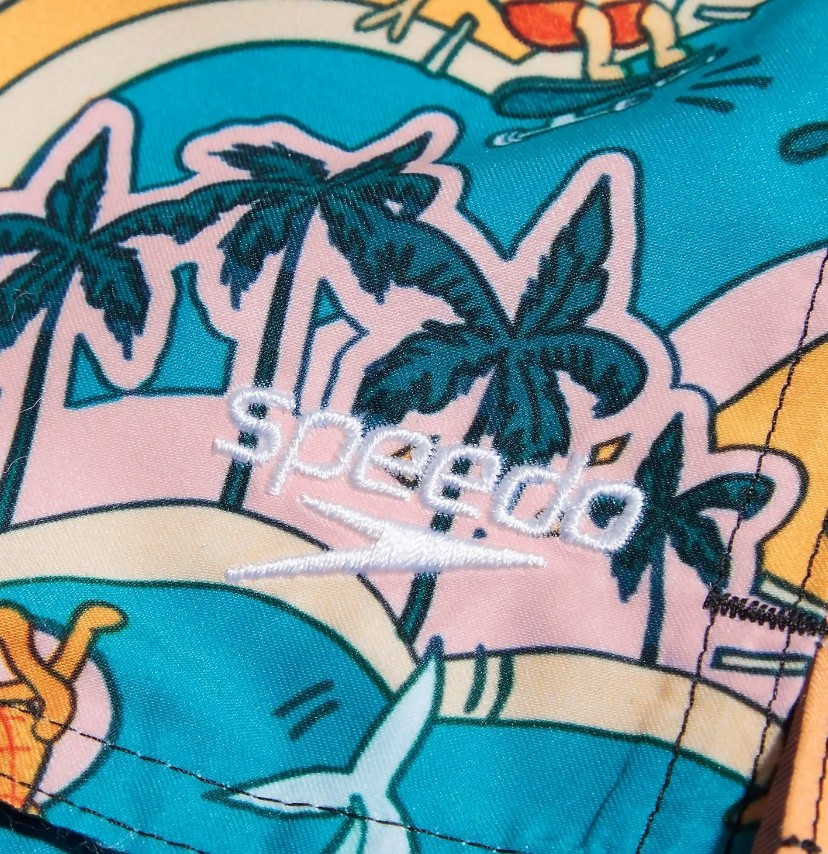 Join the Water Explorers for surfing, sun and endless fun! These retro-style infant swim shorts are big on positive vibes, thanks to its warm, sun-bleached colours and playful skateboarding characters. Ideal for your beach holiday or for fun times in the pool, the short includes an elasticated waist and an inner mesh liner (ages 3+) for a comfy and supportive fit. Made from soft, brushed-finish fabric, which feels good against delicate young skin. Plus, the polyester yarn in this Peach Poly fabric is made from 100% post-consumer waste, such as plastic bottles.