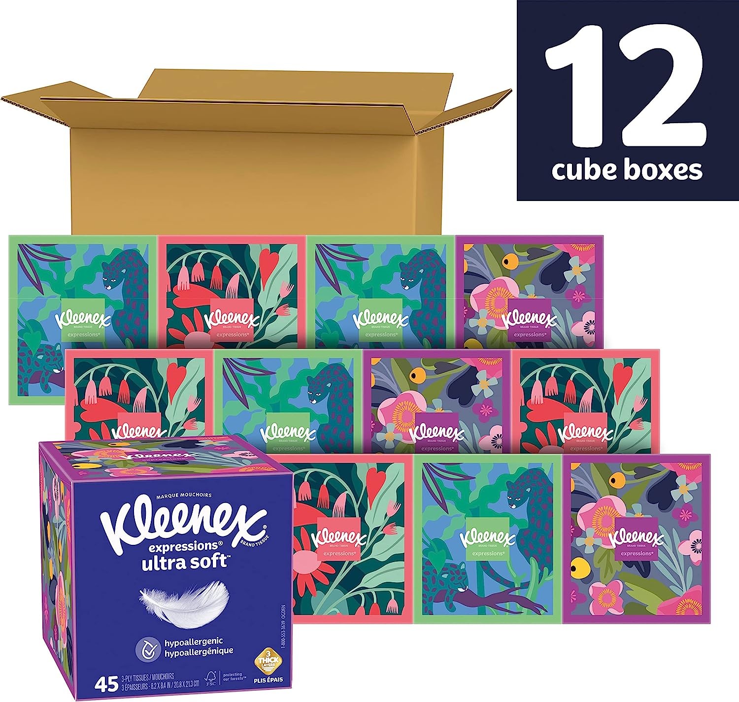 12 CUBE BOXES: Each box of Kleenex Expressions Ultra Soft contains 45 tissues—packaging may vary from what is shown.