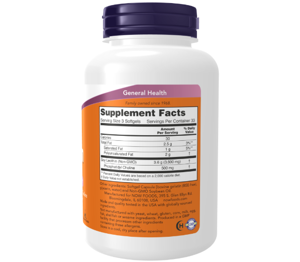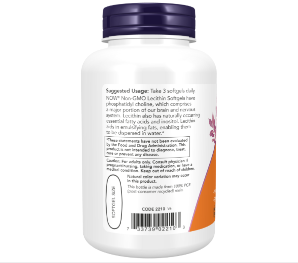 NOW® Non-GMO Lecithin Softgels have phosphatidyl choline, which comprises a major portion of our brain and nervous system. Lecithin also has naturally occurring essential fatty acids and inositol. Lecithin aids in emulsifying fats, enabling them to be dispersed in water.*