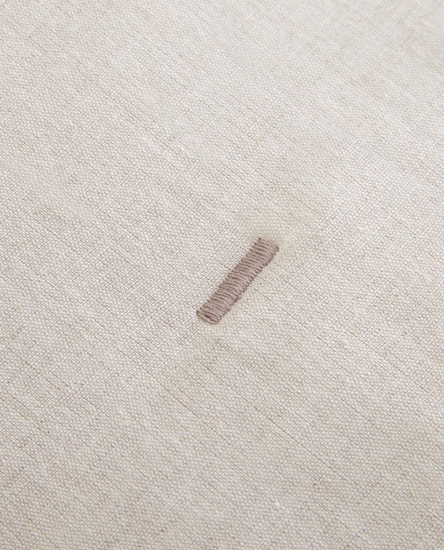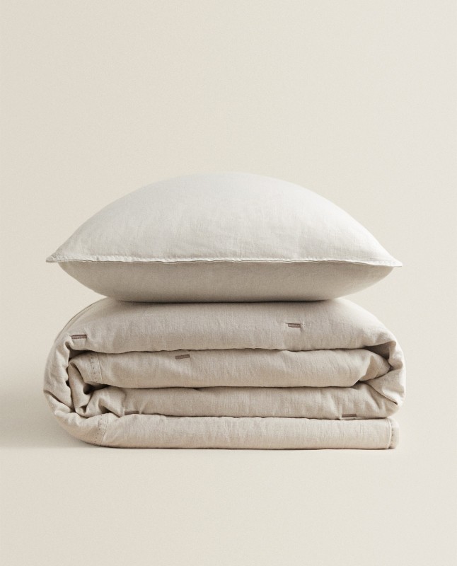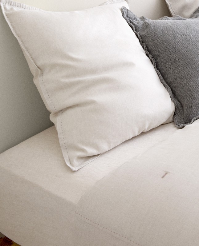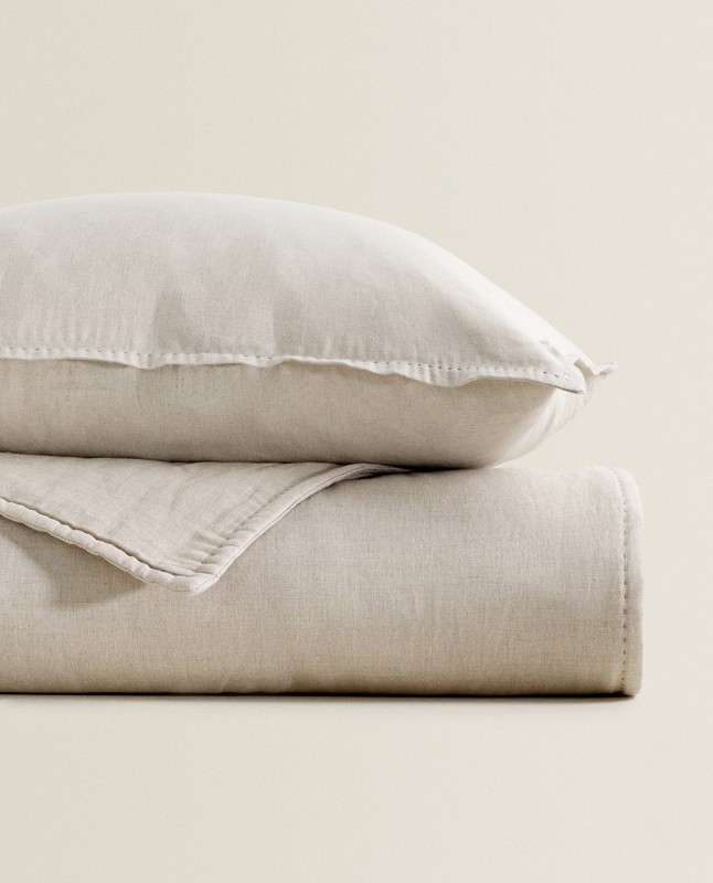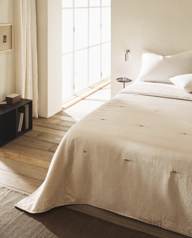 Cotton and linen quilt. Plain design with topstitching on the corners and small embroidered lines.