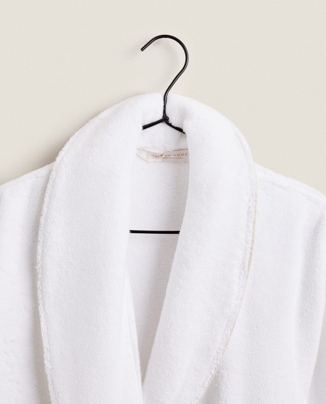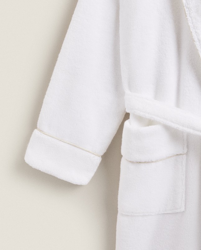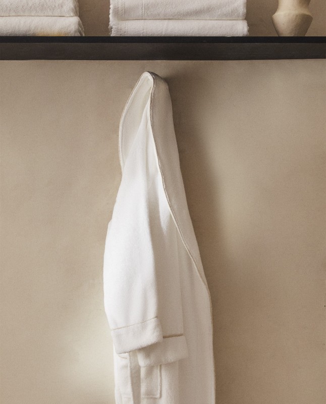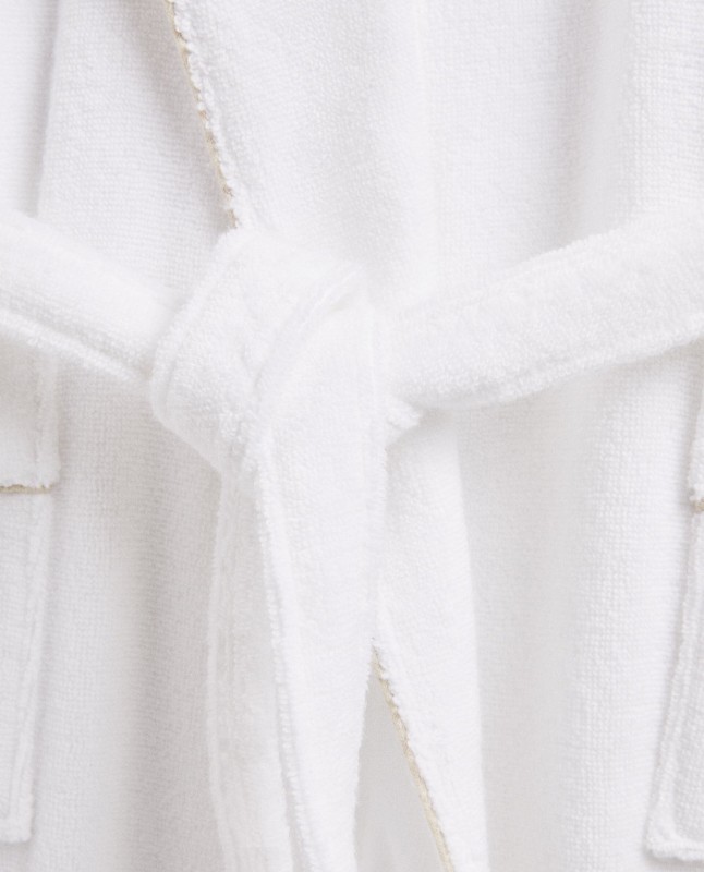 Solid color bathrobe with a pointed lapel made of 100% cotton. With linen trim detail on the collar, cuffs and pockets.