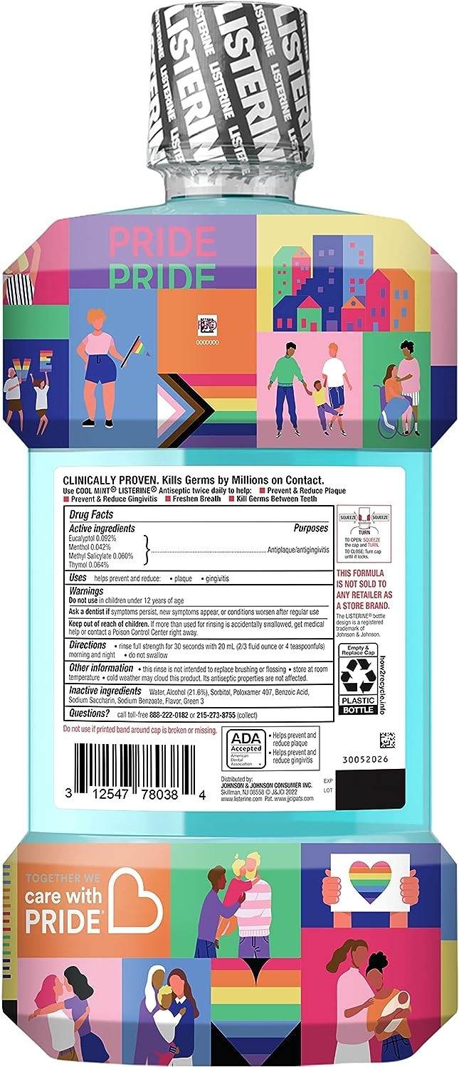 1-liter bottle of Listerine Cool Mint Antiseptic Mouthwash in special edition Care with Pride packaging kills 99.9% of germs that cause bad breath, plaque and gingivitis for a fresher and cleaner mouth than brushing alone