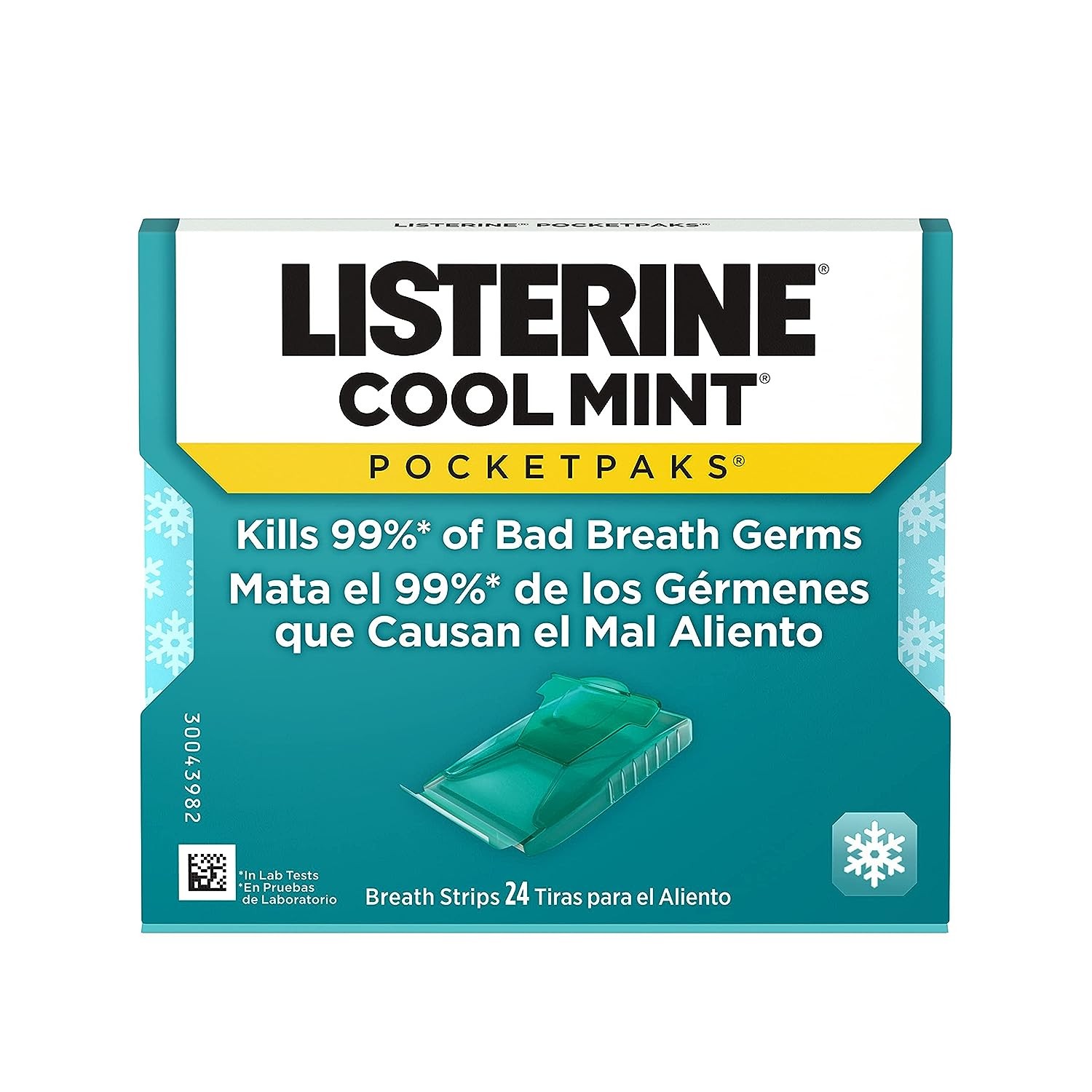 24 strips of Listerine Cool Mint PocketPaks Bad Breath Strips to kill bad breath germs effectively while freshening breath on-the-go with a Cool Mint flavor