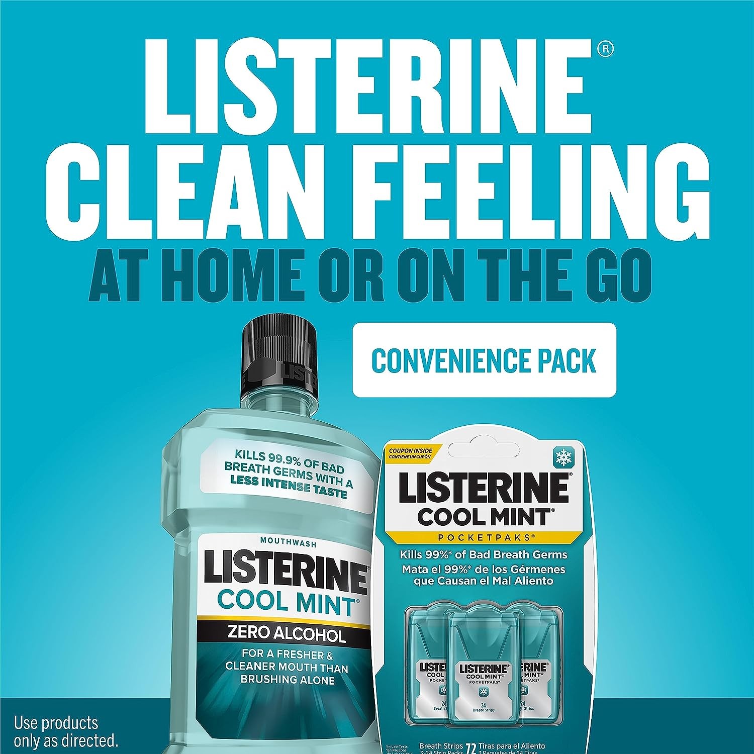 1-Liter bottle of Listerine Cool Mint Zero Alcohol Mouthwash and 3-24 packs of Listerine PocketPaks Portable Breath Strips in cool mint flavor work to kill 99% germs that cause bad breath*