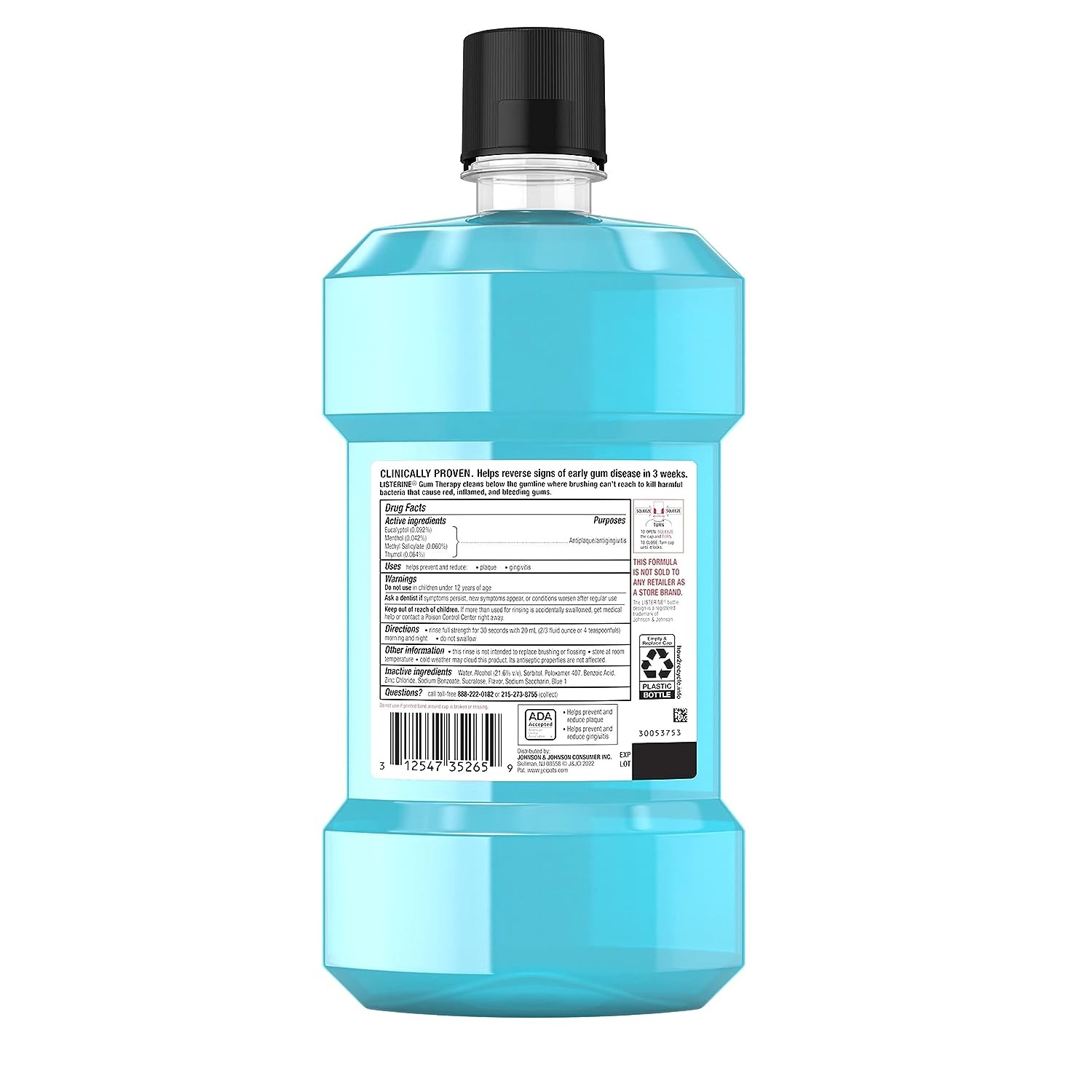 1-liter bottle of Listerine Gum Therapy Antiplaque & Antigingivitis Gum Care Mouthwash cleans below the gum line for a clean mouth and fresh breath with a refreshing glacier mint flavor