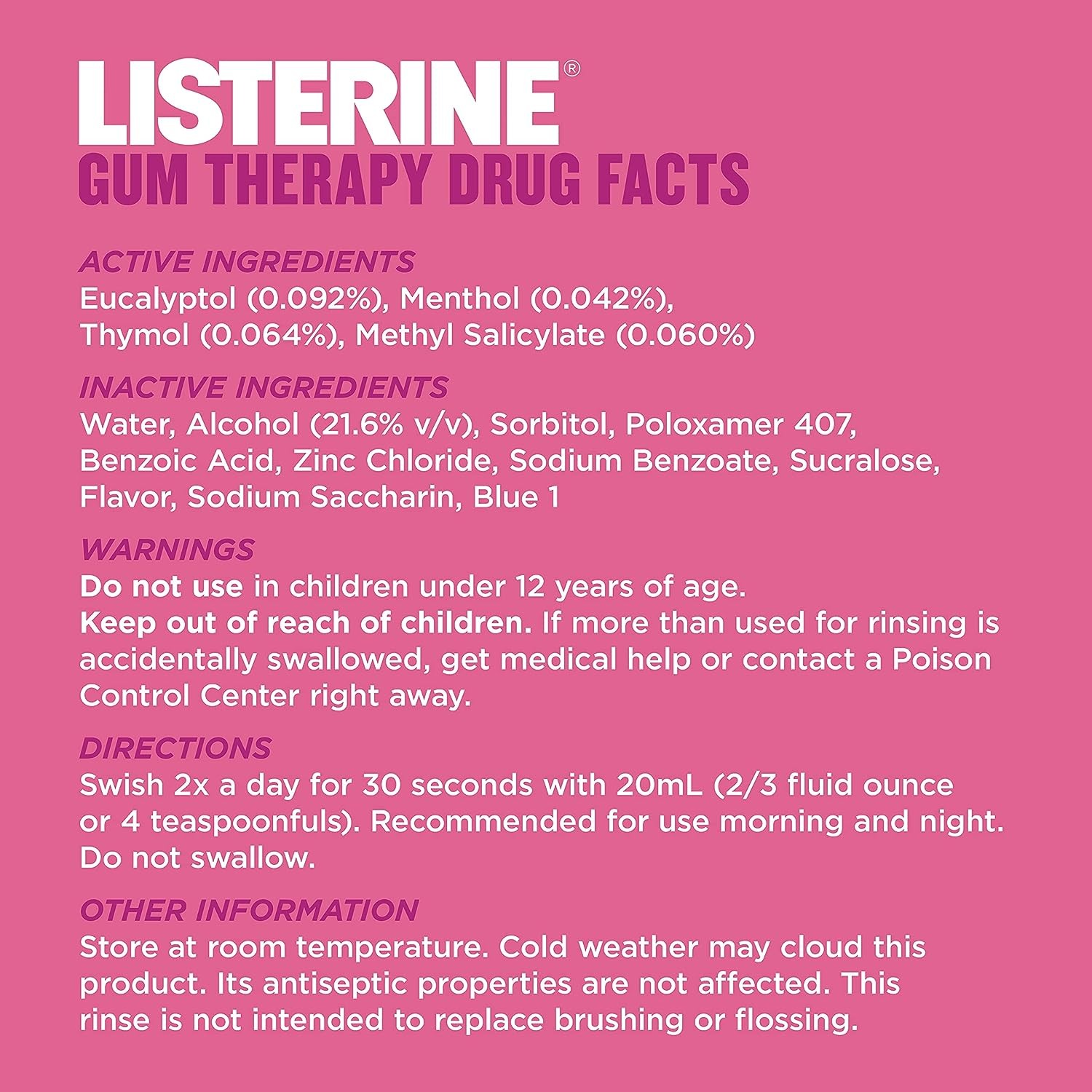 To protect your gums from gingivitis causing germs and promote a whole mouth clean, rinse full strength with 20mL of the anti-gingivitis mouthwash morning and night. Do not swallow