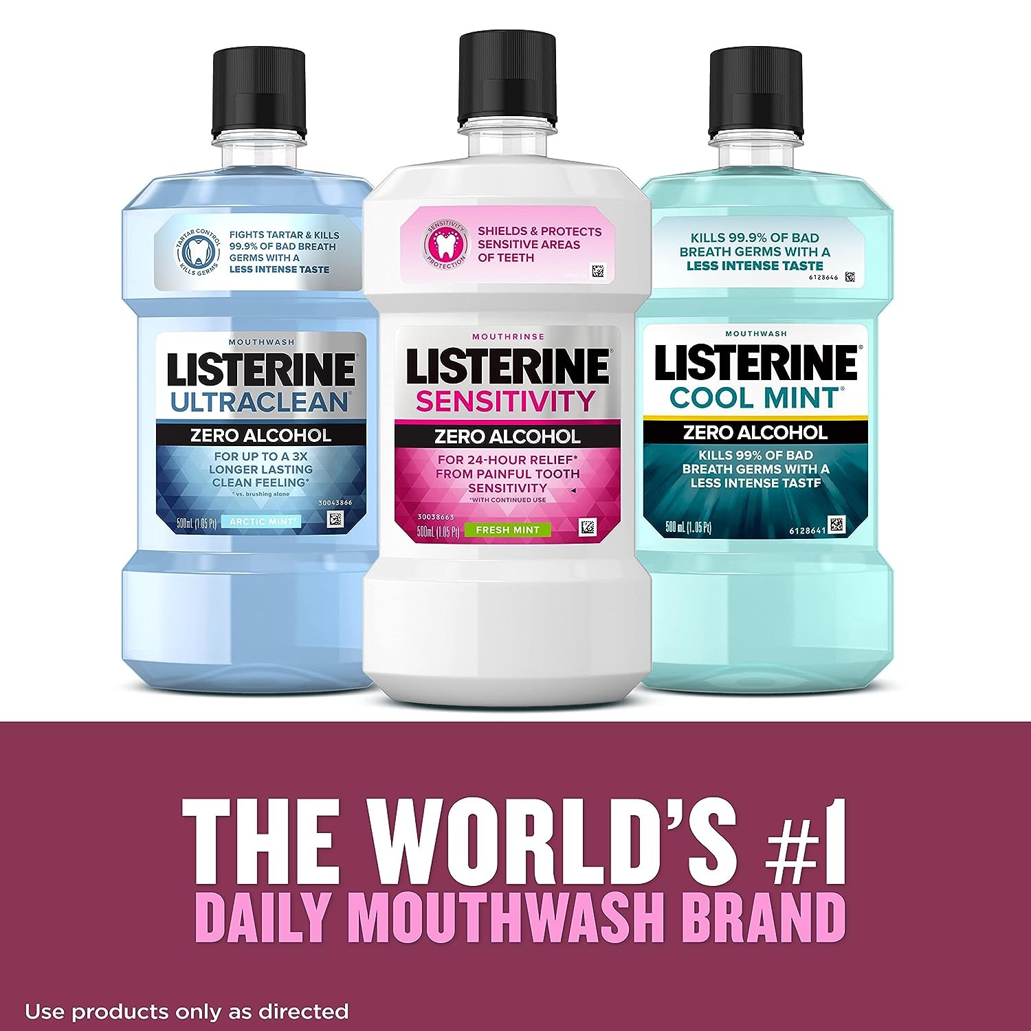 Listerine Sensitivity Mouthwash, Zero Alcohol, Less Intense Formula, for Sensitive Teeth, Bad Breath Treatment, Alcohol Free Mouth Wash for Adults; Fresh Mint Flavor, 500 mL (Pack of 2)