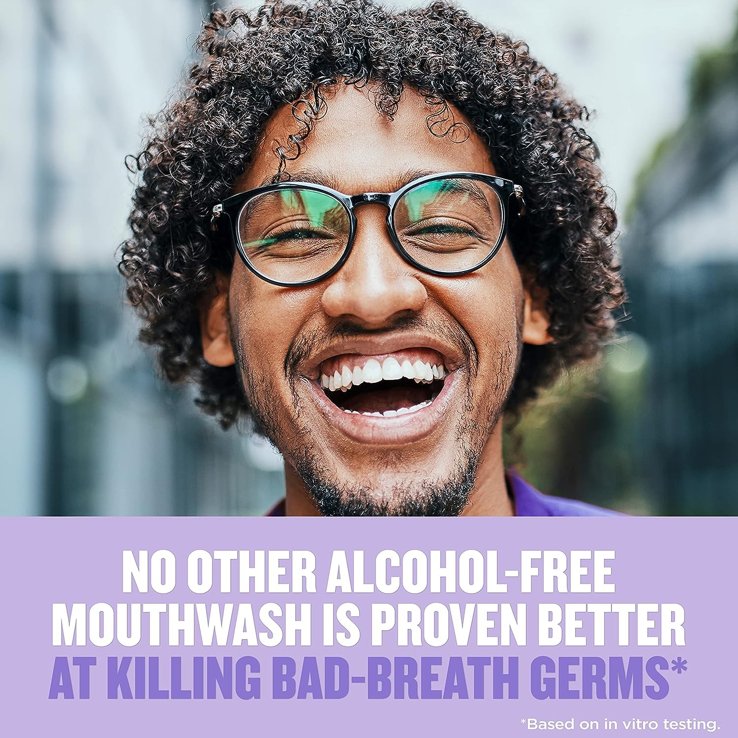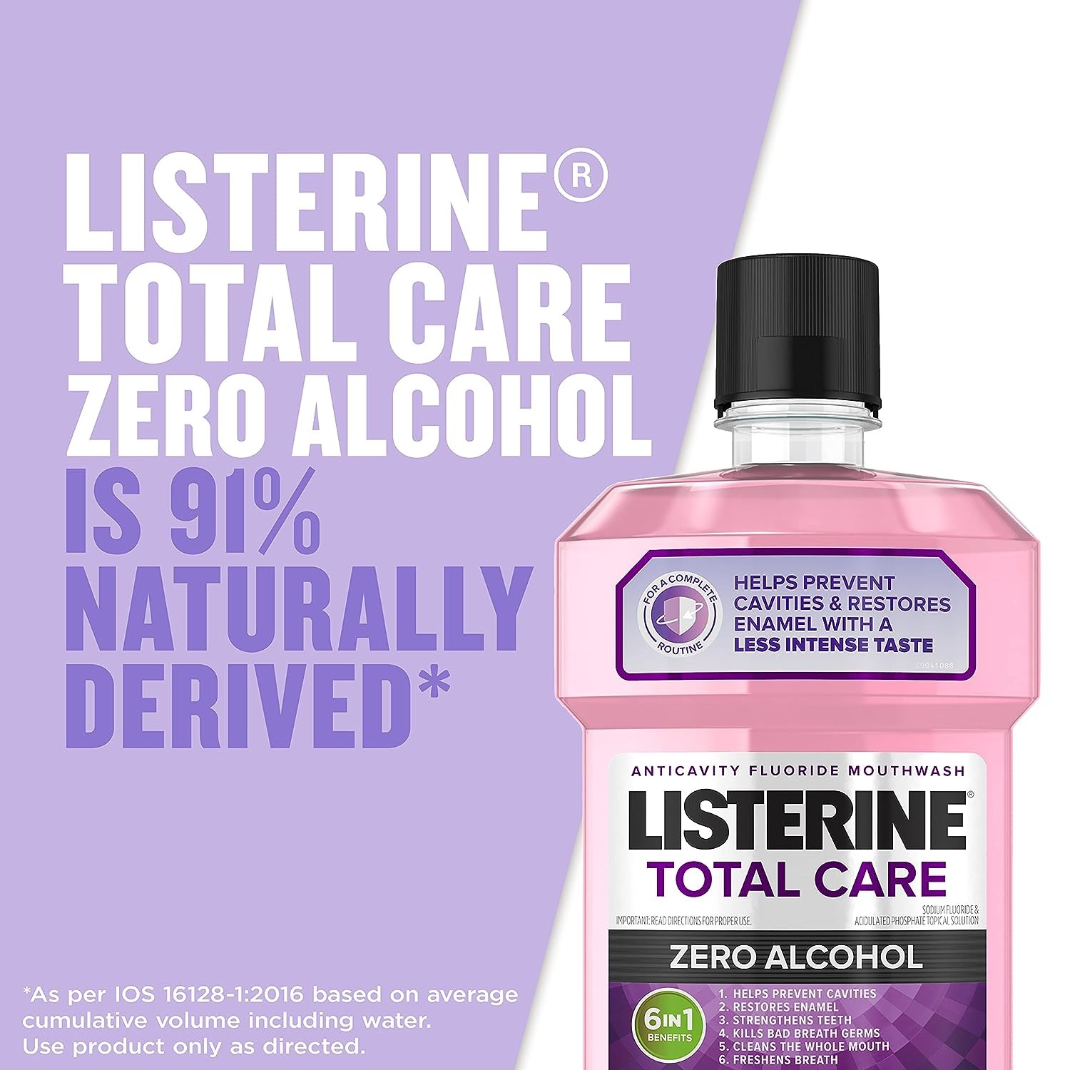 ZERO-ALCOHOL MOUTHWASH: 500 mL bottle of Listerine Total Care Zero alcohol-free fluoride anticavity mouthwash in Fresh Mint flavor. No other alcohol-free mouthwash is proven better at killing bad-breath germs* *Based on in vitro testing