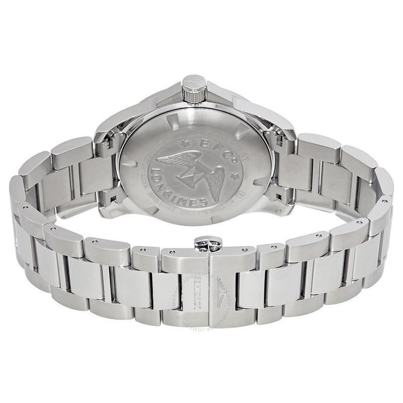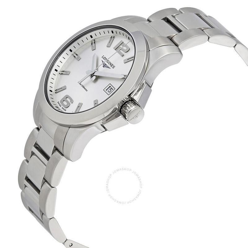 Stainless steel case with a stainless steel bracelet. Fixed stainless steel bezel. Silver dial with silver-tone hands and index hour markers. Arabic numerals mark the 6 and 12 o'clock positions. Minute markers around the outer rim. Dial Type: Analog. Date display at the 3 o'clock position. Longines calibre 157 quartz movement. Scratch resistant sapphire crystal. Screw down crown. Solid case back. Case size: 41 mm. Case thickness: 13 mm. Round case shape. Band width: 21 mm. Deployment clasp. Water resistant at 300 meters / 1000 feet. Functions: date, hour, minute, second, eol. Luxury watch style. Watch label: Swiss Made. Longines Conquest Silver Dial Stainless Steel Mens Watch L37594766.
