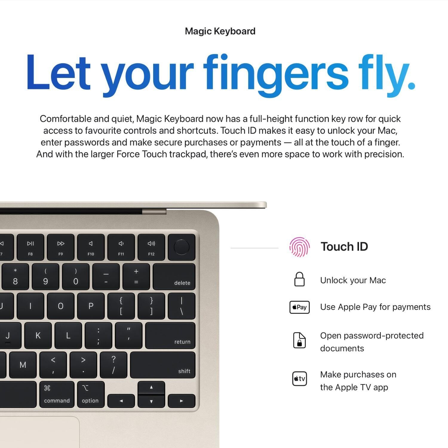 Apple Retina, Scissor Keyboard, 2x Thunderbolt 3/USB 4 Ports, Built-in Speakers, Headphone Port, MagSafe 3, Backlit Keyboard, Bluetooth, Built-in Microphone, Built-in Webcam, Force Touch Trackpad, Multi-Touch Trackpad, Touch ID