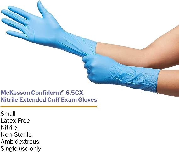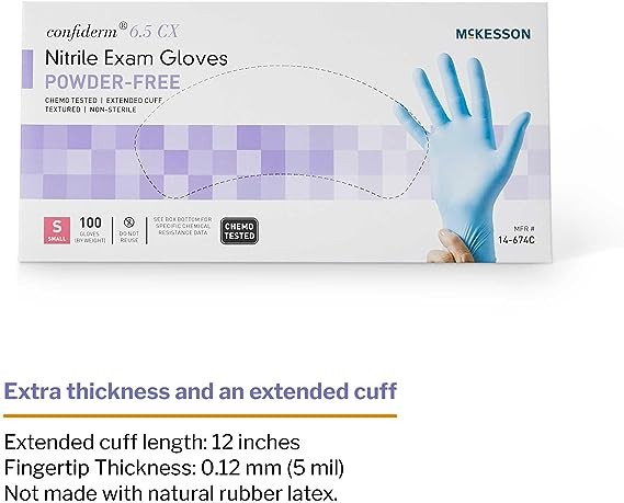 Size Small gloves are disposable and extra-thick with an extended cuff length of 12 inches; no interior coating; latex-free