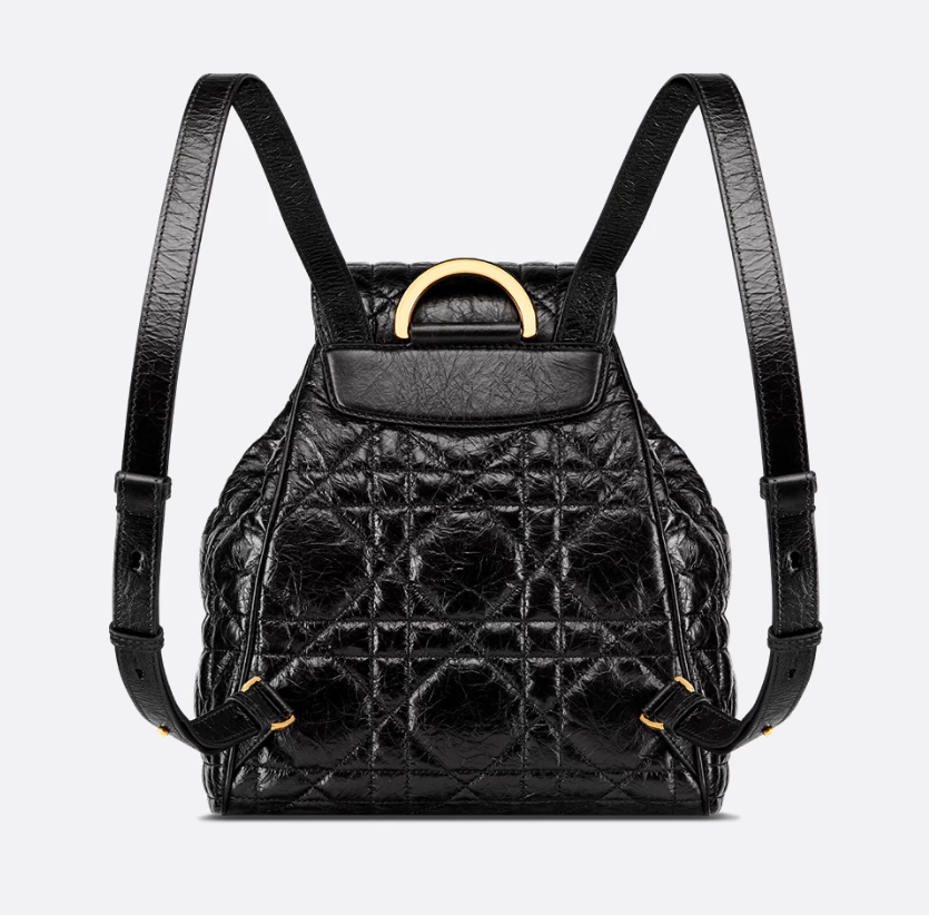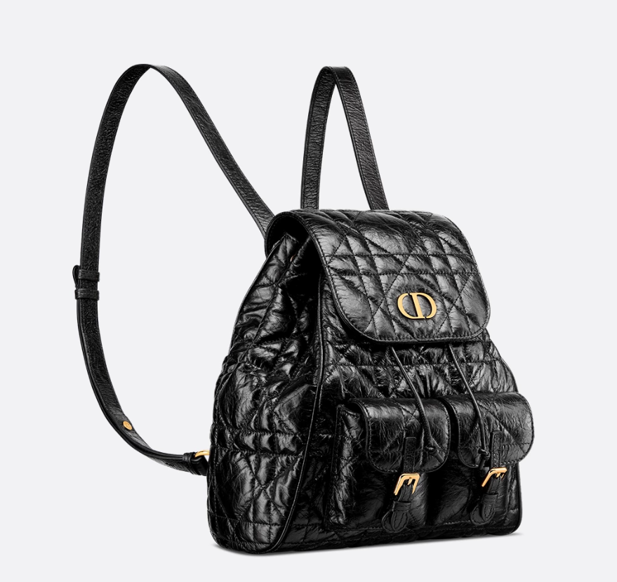 The Dior Caro backpack embodies modern and elegant style. Demonstrating the House's savoir-faire, the style is crafted in black crinkled calfskin elevated by a quilted Macrocannage motif. It features a flap adorned with an antique gold-finish metal CD signature that opens to reveal a spacious drawstring main compartment, while two small flap pockets can hold all the small essentials. The medium backpack has a gold-finish handle and adjustable straps for added comfort.