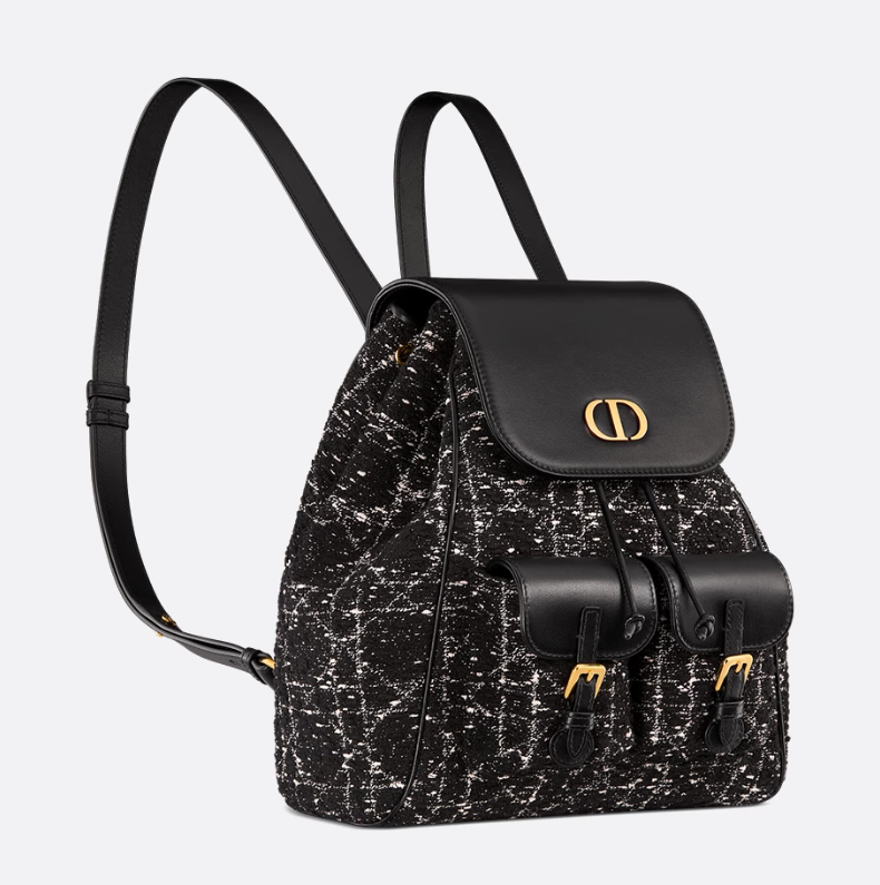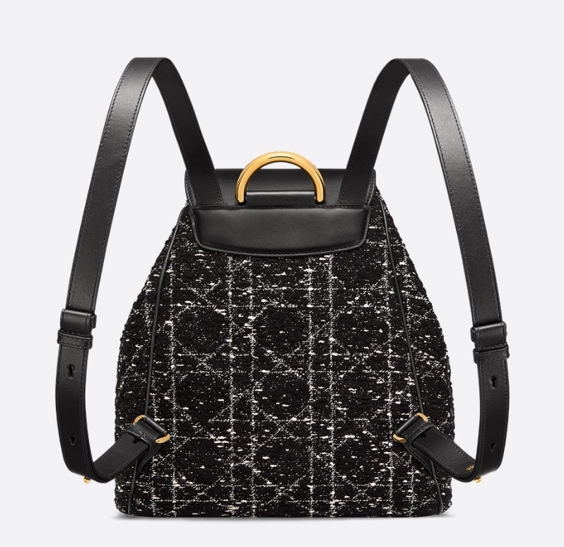 The Dior Caro backpack embodies modern and elegant style. Crafted in black tweed with a white Cannage motif, the design features a flap adorned with an antique gold-finish metal CD signature that opens to reveal a spacious drawstring main compartment, while two small flap pockets can hold all the small essentials. The medium backpack has a gold-finish handle and adjustable straps for added comfort.