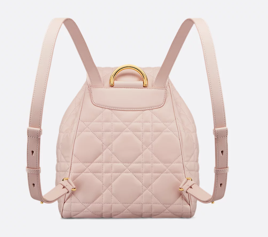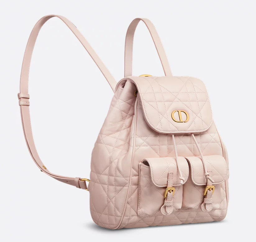 The Dior Caro backpack embodies modern and elegant style. Crafted in powder pink lambskin elevated by Macrocannage topstitching, the design features a flap adorned with an antique gold-finish metal CD signature that opens to reveal a spacious drawstring main compartment, while two small flap pockets can hold all the small essentials. The medium backpack has a gold-finish handle and adjustable straps for added comfort.