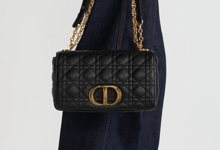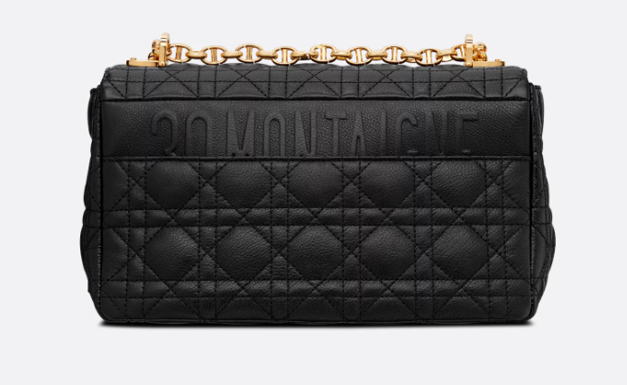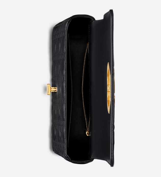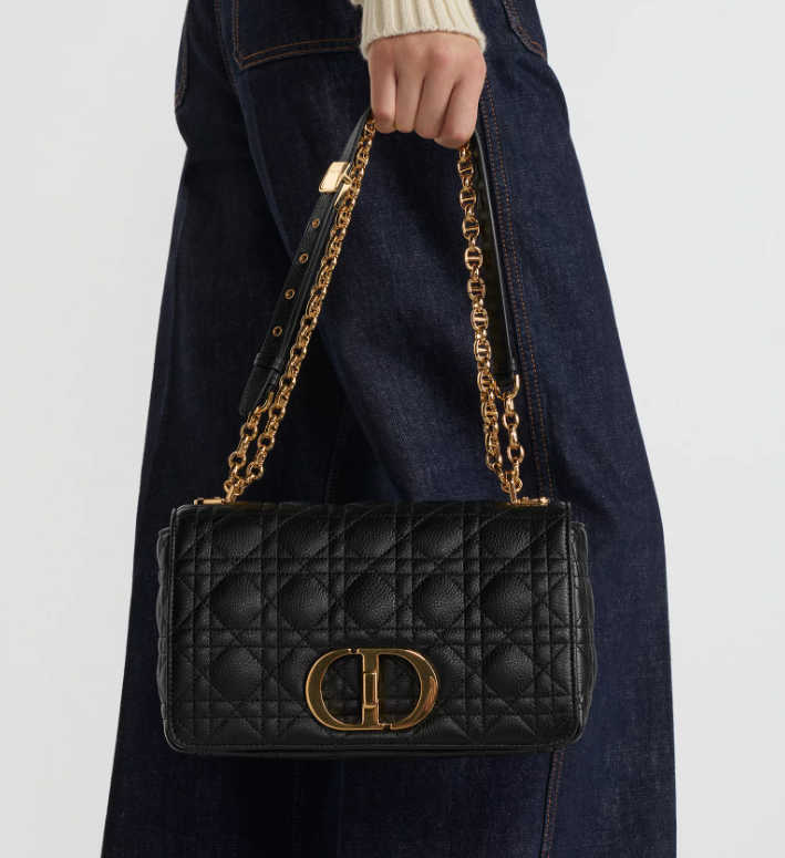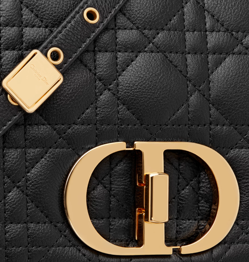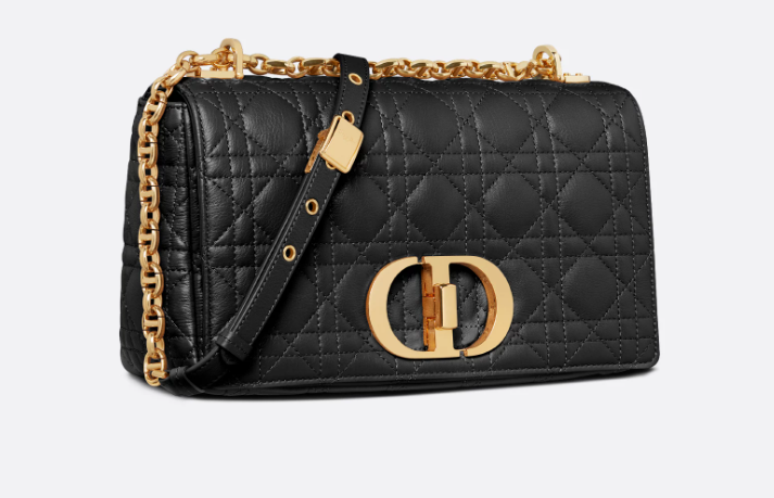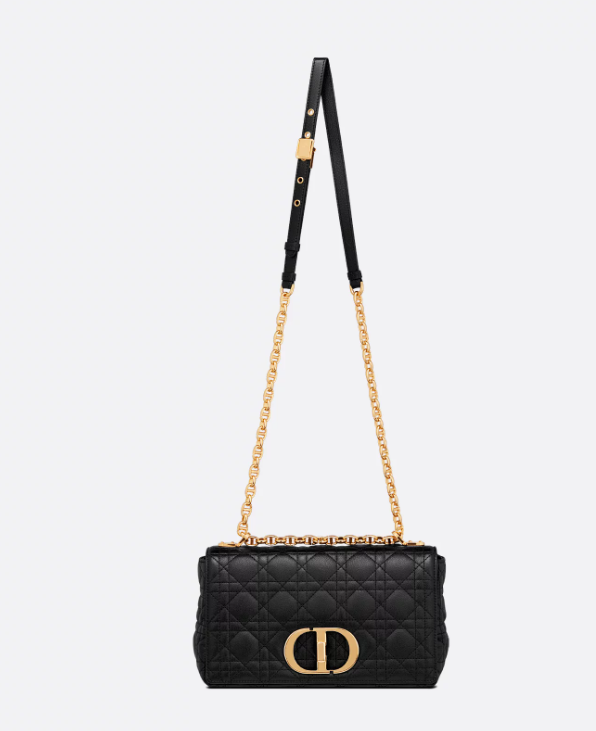 The Dior Caro bag combines modernity with timeless elegance. The style is crafted in black supple calfskin with Cannage stitching. The bag showcases a flap adorned with an antique gold-finish metal CD twist clasp, inspired by the seal of a Christian Dior perfume bottle. The detachable chain strap with CD signature links allows the medium bag to be carried by hand, worn over the shoulder or crossbody, and may be replaced by one of the House's wide embroidered straps for day or evening attire.