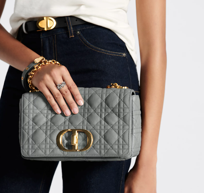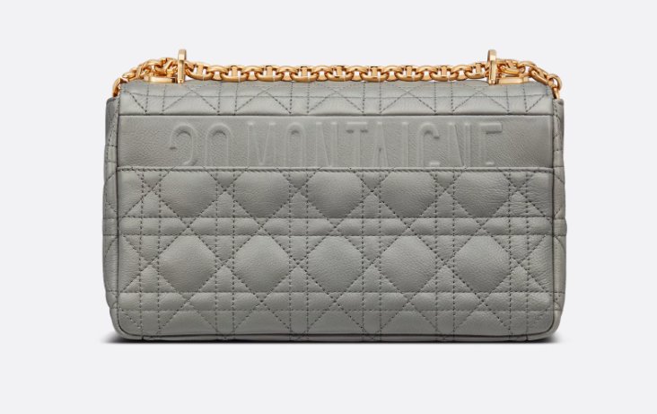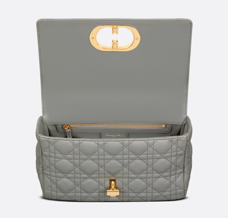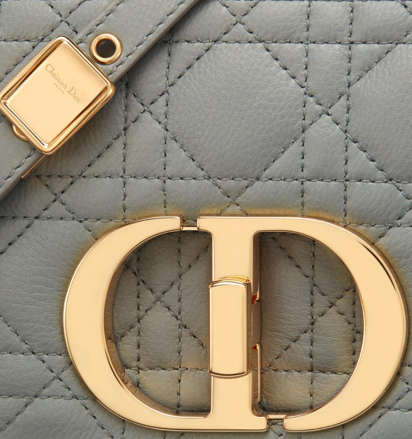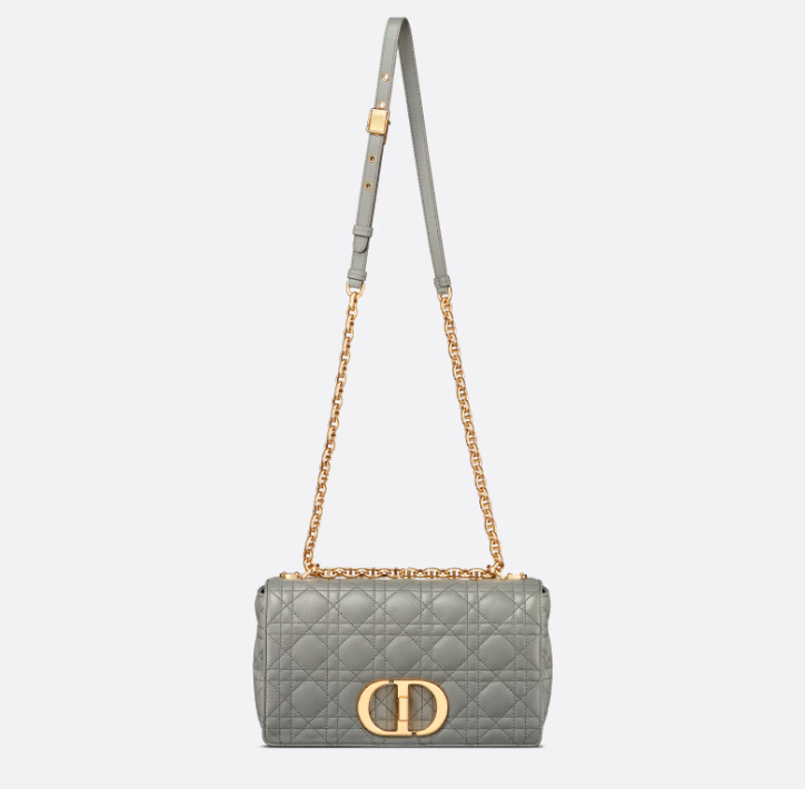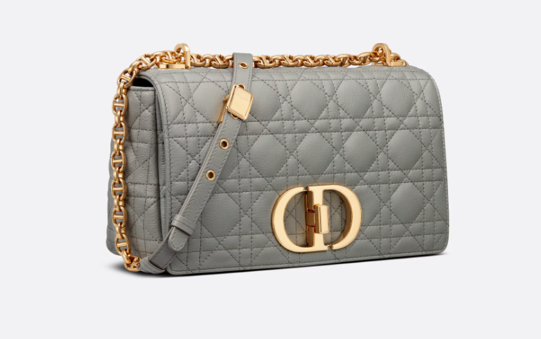 The Dior Caro bag combines modernity with timeless elegance. The silhouette is crafted in stone gray supple calfskin with Cannage stitching. The supple bag features a flap adorned with an antique gold-finish metal CD twist clasp, inspired by the seal of a Christian Dior perfume bottle. The detachable chain strap with CD signature links allows the medium bag to be carried by hand, worn over the shoulder or crossbody, and may be replaced by one of the House's wide embroidered straps for day or evening attire wear.