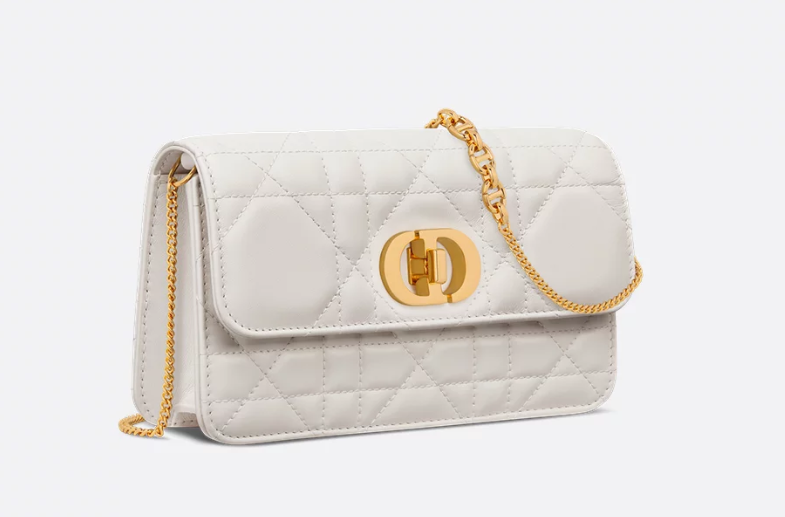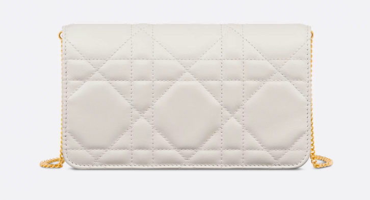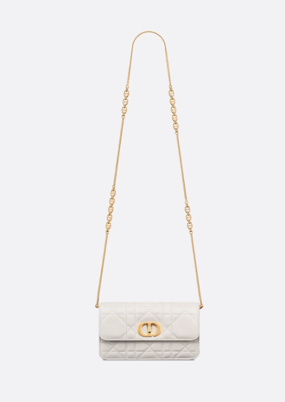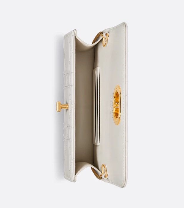 The Miss Caro pouch with chain is practical and graceful. Made in latte lambskin enhanced by Macrocannage topstitching, it features a flap with an antique gold-finish metal CD twist clasp inspired by the seal of a Christian Dior perfume bottle, opening to reveal a compartment that will accommodate all the essentials. The chain strap allows it to be carried comfortably by hand, worn over the shoulder or crossbody as an ideal daily pouch.