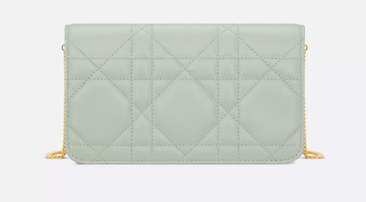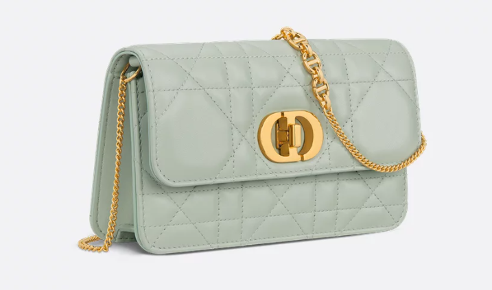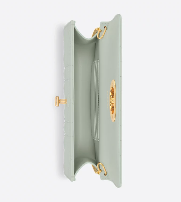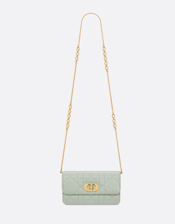 The Miss Caro pouch with chain is practical and graceful. Made in pistachio green lambskin enhanced by Macrocannage topstitching, it features a flap with an antique gold-finish metal CD twist clasp inspired by the seal of a Christian Dior perfume bottle, opening to reveal a compartment that will accommodate all the essentials. The chain strap allows it to be carried comfortably by hand, worn over the shoulder or crossbody as an ideal daily pouch.