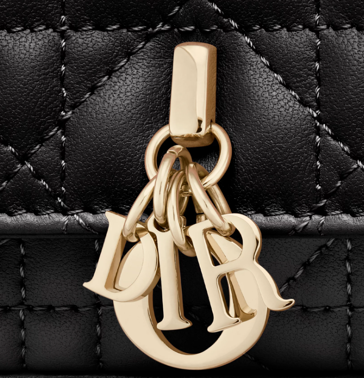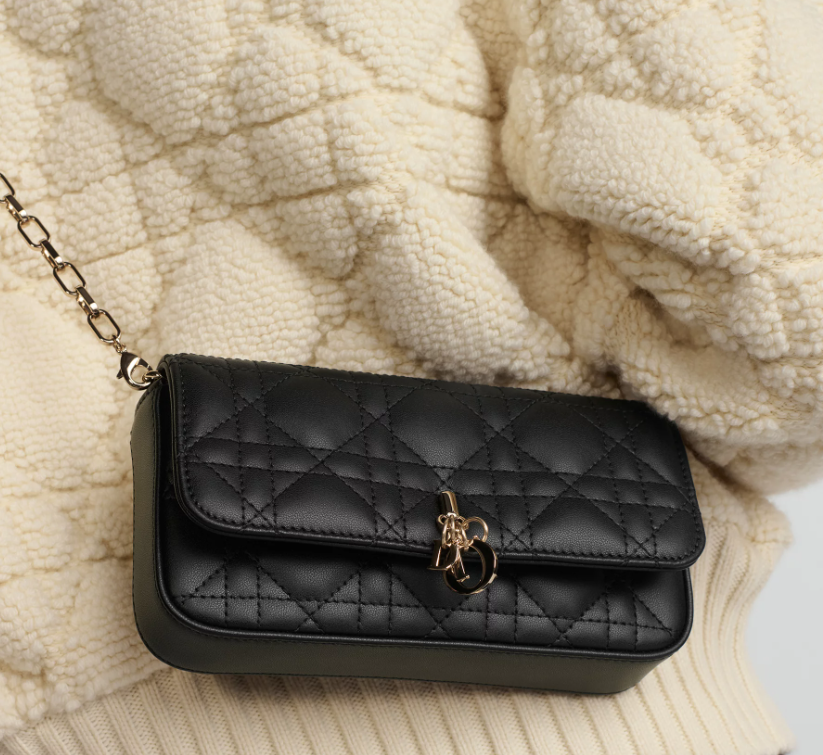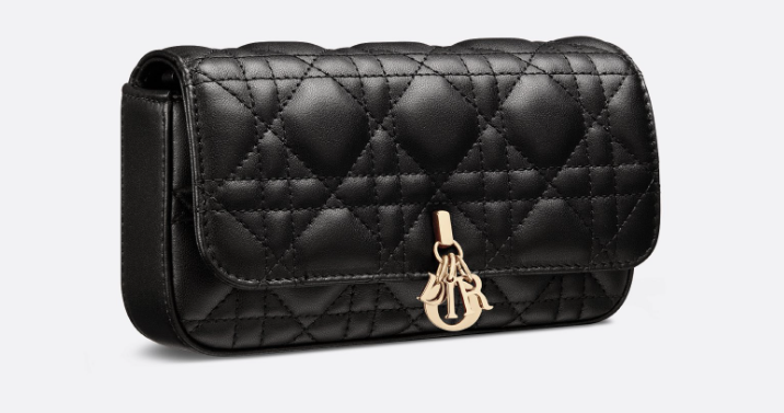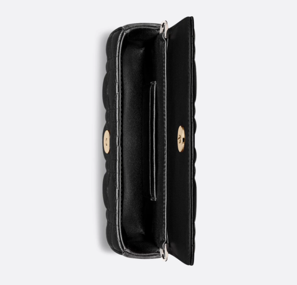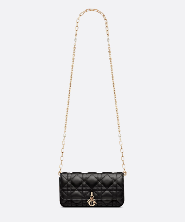 The My Dior - Dior Talk Phone Pouch is a clever and sophisticated creation. Crafted in black Cannage lambskin, it features pale gold-finish metal D.I.O.R. charms. Completed by an elegant removable chain punctuated with resin pearls, the phone pouch can be carried by hand, worn over the shoulder or crossbody.