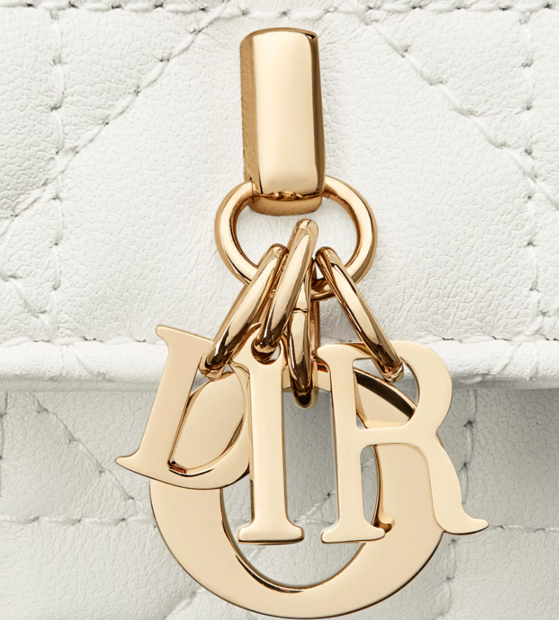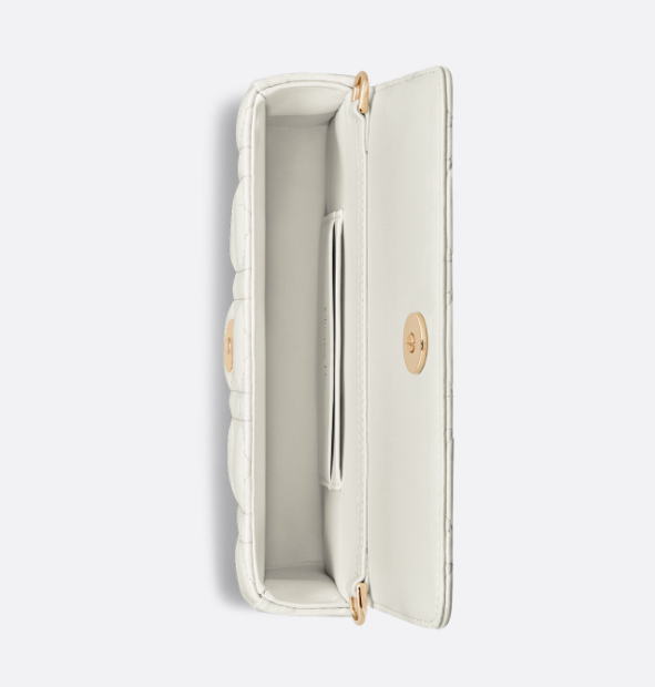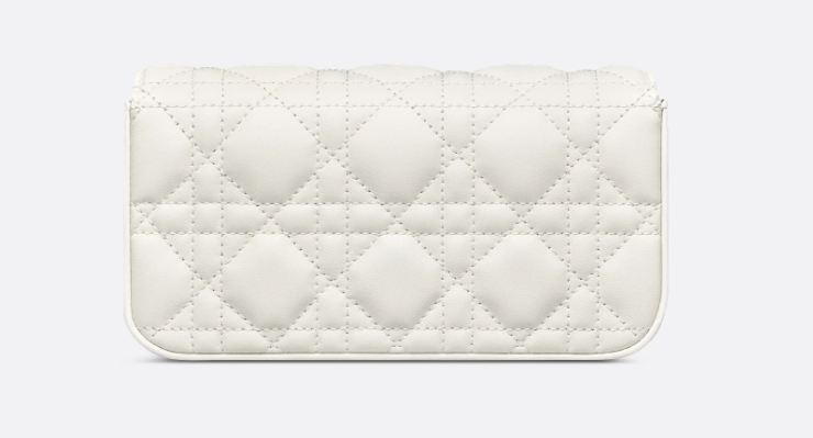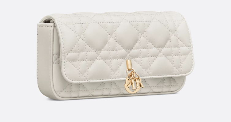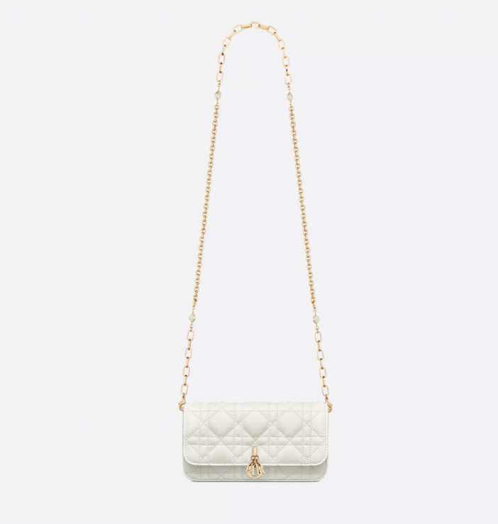 The My Dior - Dior Talk Phone Pouch is a clever and sophisticated creation. Crafted in latte Cannage lambskin, it features pale gold-finish metal D.I.O.R. charms. Completed by an elegant removable chain punctuated with resin pearls, the phone pouch can be carried by hand, worn over the shoulder or crossbody.