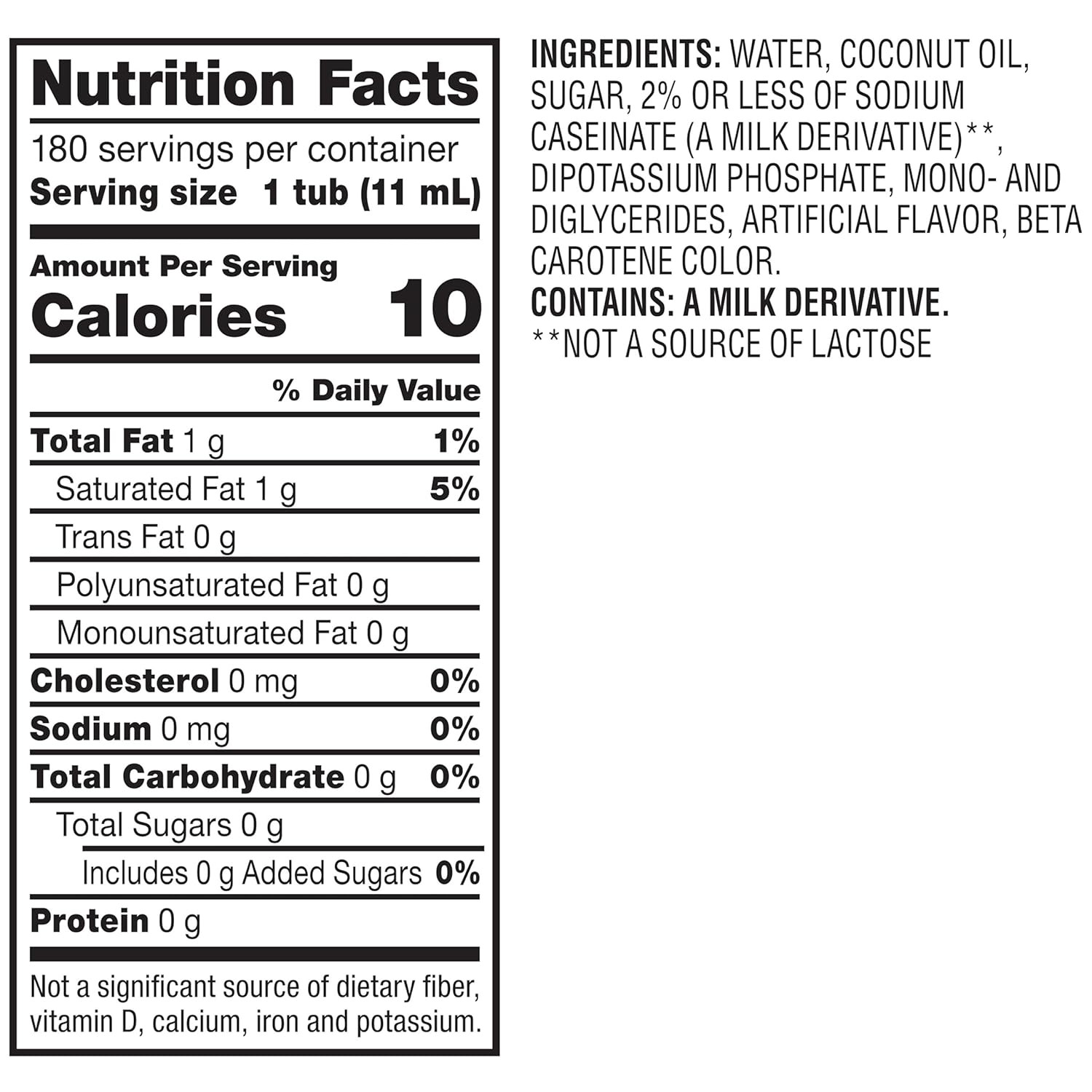WATER, COCONUT OIL, SUGAR, AND LESS THAN 2% OF SODIUM CASEINATE (A MILK DERIVATIVE)**, DIPOTASSIUM PHOSPHATE, MONO- AND DIGLYCERIDES, ARTIFICIAL FLAVOR, BETA CAROTENE COLOR. **NOT A SOURCE OF LACTOSE