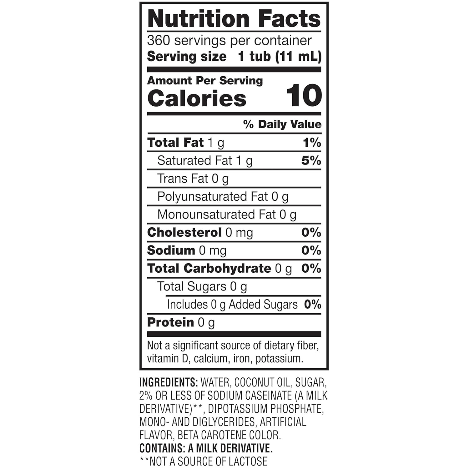 WATER, COCONUT OIL, SUGAR, 2% OR LESS OF SODIUM CASEINATE (A MILK DERIVATIVE)**, DIPOTASSIUM PHOSPHATE, MONO- AND DIGLYCERIDES, ARTIFICIAL FLAVOR, BETA CAROTENE COLOR.**NOT A SOURCE OF LACTOSE