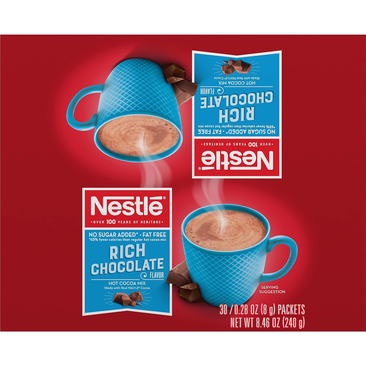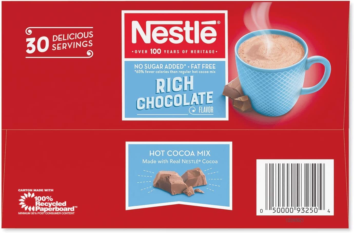 Nestle Hot Cocoa, No Sugar Added, Fat Free Rich Chocolate Flavor is a rich-tasting, no sugar added and fat free hot cocoa mix that creates a rich and indulgent chocolate flavor; made with real Nestle cocoa using sustainably-sourced cocoa beans