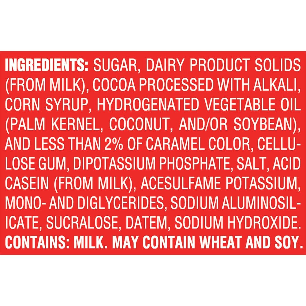 SUGAR, DAIRY PRODUCT SOLIDS (FROM MILK), COCOA PROCESSED WITH ALKALI, CORN SYRUP, HYDROGENATED VEGETABLE OIL (PALM KERNEL, COCONUT, AND/OR SOYBEAN), AND LESS THAN 2% OF CARAMEL COLOR, CELLULOSE GUM, DIPOTASSIUM PHOSPHATE, SALT, ACID CASEIN (FROM MILK), ACESULFAME POTASSIUM, MONO- AND DIGLYCERIDES, SODIUM ALUMINOSILICATE, SUCRALOSE, DATEM, SODIUM HYDROXIDE.CONTAINS: MILK INGREDIENTS.MAY CONTAIN SOY AND WHEAT