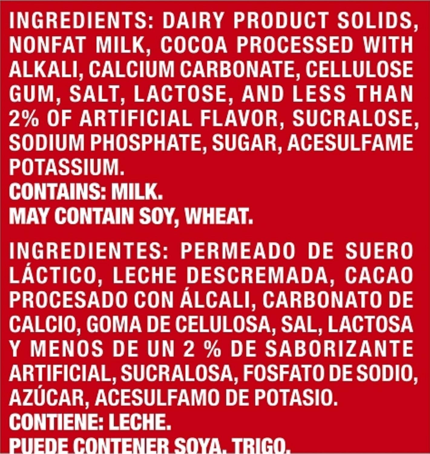 'DAIRY PRODUCT SOLIDS (FROM MILK), SKIM MILK, COCOA PROCESSED WITH ALKALI, CALCIUM CARBONATE, CELLULOSE GUM, SALT, LACTOSE, AND LESS THAN 2% OF ARTIFICIAL FLAVORS, SUCRALOSE, SODIUM PHOSPHATE, ACESULFAME POTASSIUM.'