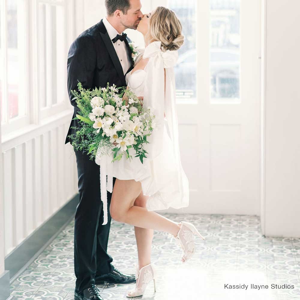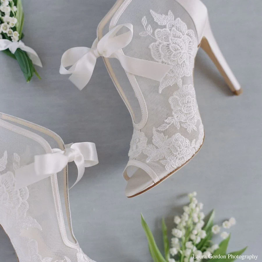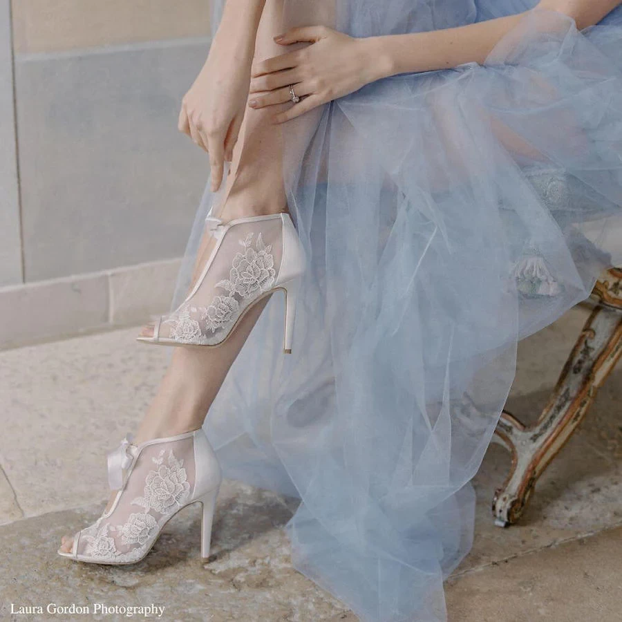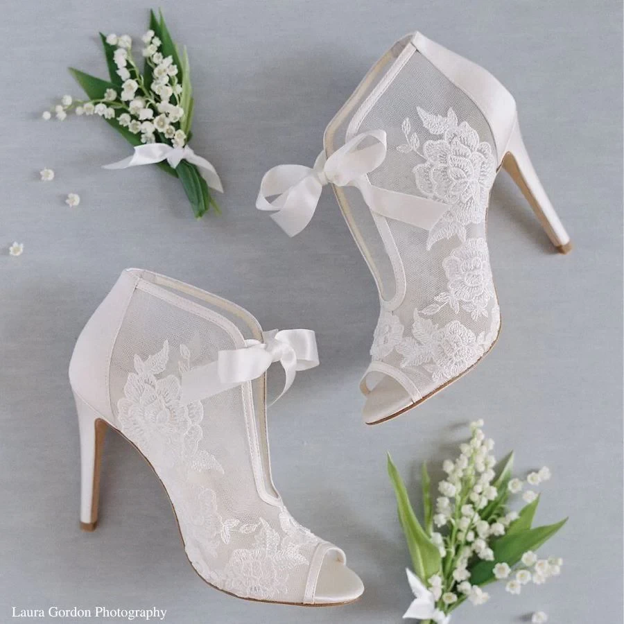 Nikki lace wedding booties offer brides an ethereal glow cast by the subtle shimmer of ivory illusion mesh. A peep toe and deep cutout down the front sweeten the look with a flirty show of skin. A lace appliqué of intricate Damask roses blooms across the sides and top line of this sweet yet sophisticated ivory lace bootie. Secure Nikki's fit with the crisp silk ribbon tied at the front. Bonus? Bella Belle's signature pliable illusion mesh ensures a comfortable and customized fit.