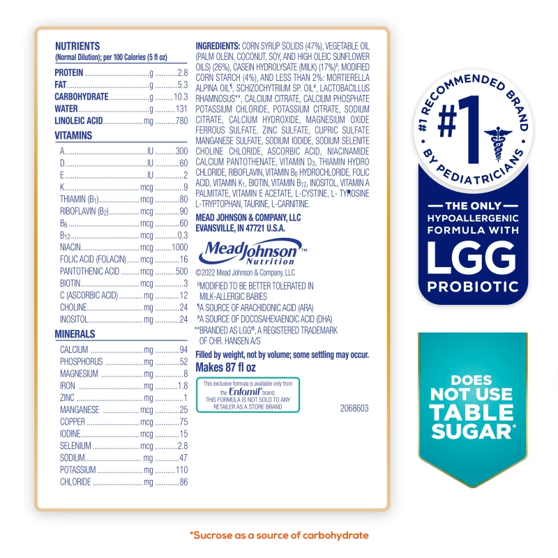 CORN SYRUP SOLIDS (47%), VEGETABLE OIL (PALM OLEIN, COCONUT, SOY, AND HIGH OLEIC SUNFLOWER OILS) (26%), CASEIN HYDROLYSATE (MILK) (17%)*, MODIFIED CORN STARCH (4%), AND LESS THAN 2%: MORTIERELLA ALPINA OIL†, SCHIZOCHYTRIUM SP. OIL‡, LACTOBACILLUS RHAMNOSUS§, CALCIUM CITRATE, CALCIUM PHOSPHATE, POTASSIUM CHLORIDE, POTASSIUM CITRATE, SODIUM CITRATE, CALCIUM HYDROXIDE, MAGNESIUM OXIDE, FERROUS SULFATE, ZINC SULFATE, CUPRIC SULFATE, MANGANESE SULFATE, SODIUM IODIDE, SODIUM SELENITE, CHOLINE CHLORIDE, ASCORBIC ACID, NIACINAMIDE, CALCIUM PANTOTHENATE, VITAMIN D3, THIAMIN HYDROCHLORIDE, RIBOFLAVIN, VITAMIN B6 HYDROCHLORIDE, FOLIC ACID, VITAMIN K1, BIOTIN, VITAMIN B12, INOSITOL, VITAMIN A PALMITATE, VITAMIN E ACETATE, L-CYSTINE, L-TYROSINE, L-TRYPTOPHAN, TAURINE, L-CARNITINE.