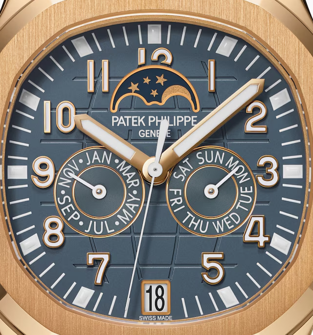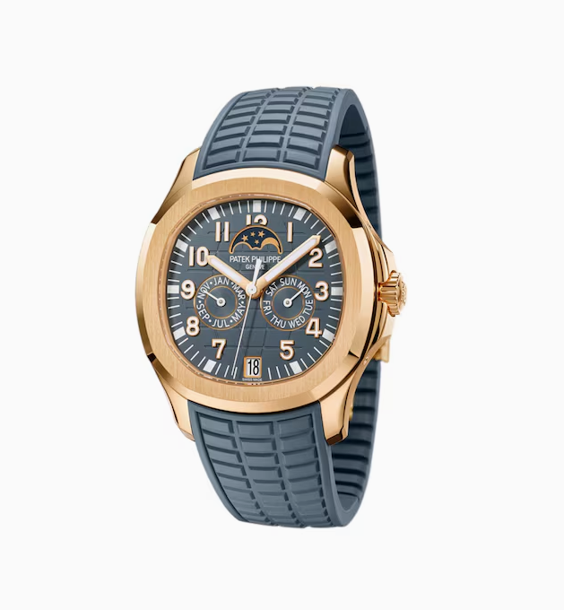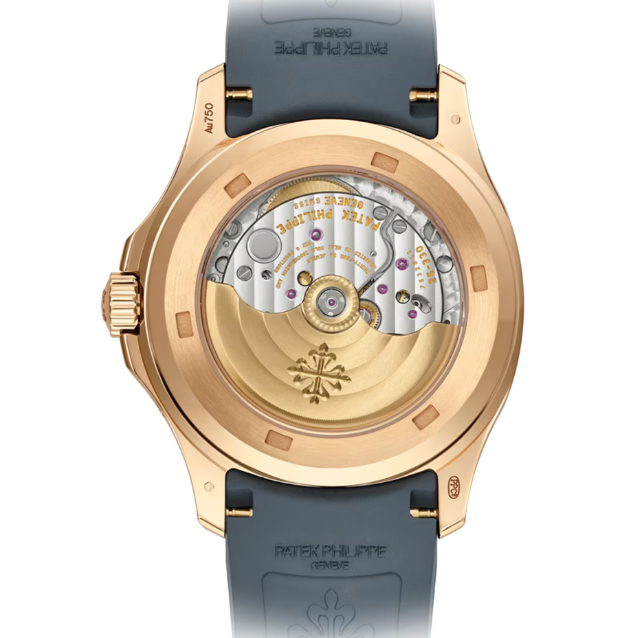 The iconic design of the rose gold case and bezel with a rounded octagonal shape is enhanced by the contrast between polished and satin-brushed finishes. The contemporary “sporty chic" style is reinforced by the blue-gray dial and composite strap with Aquanaut pattern.
