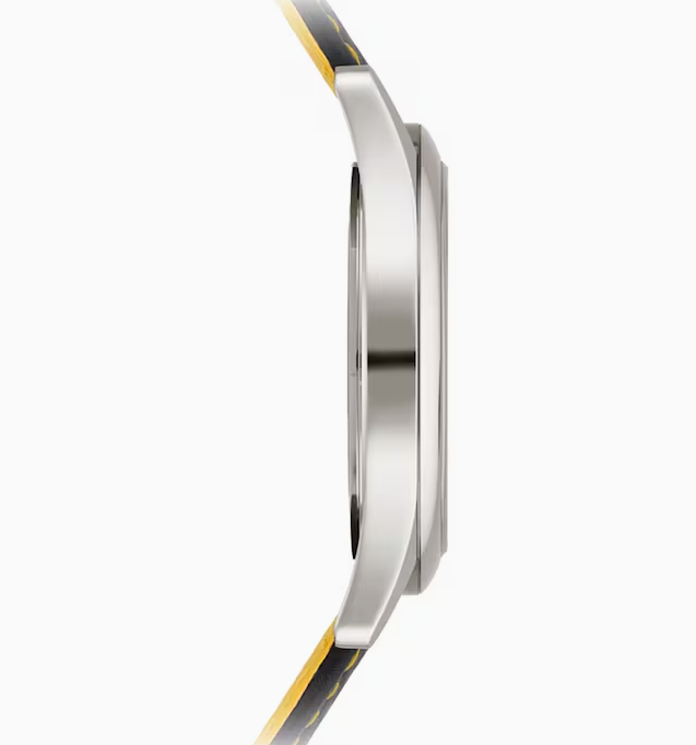 This dynamic design is enhanced by touches of yellow (6007G-001), red (6007G-010) or sky blue (6007G-011) on the counters and seconds hands as well as on the stitching and lining of the black calfskin straps with embossed “carbon” pattern.