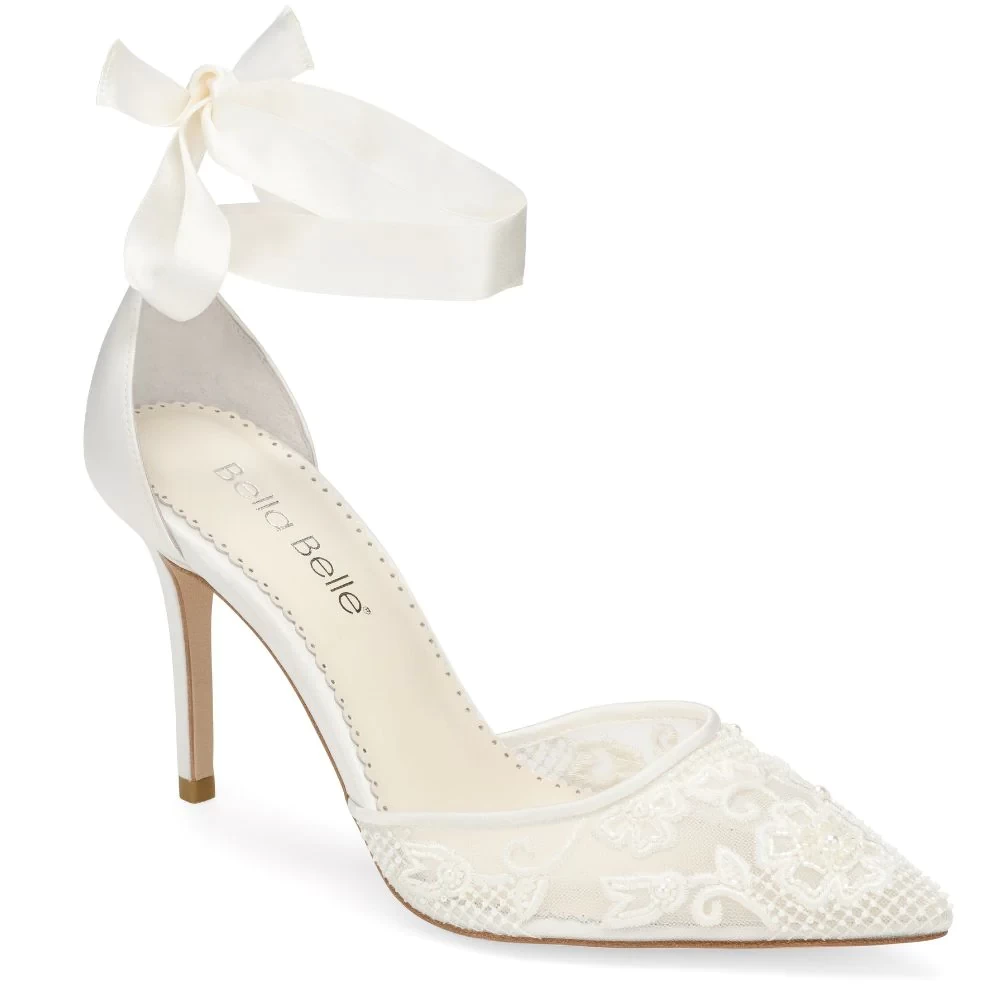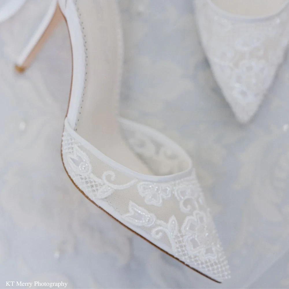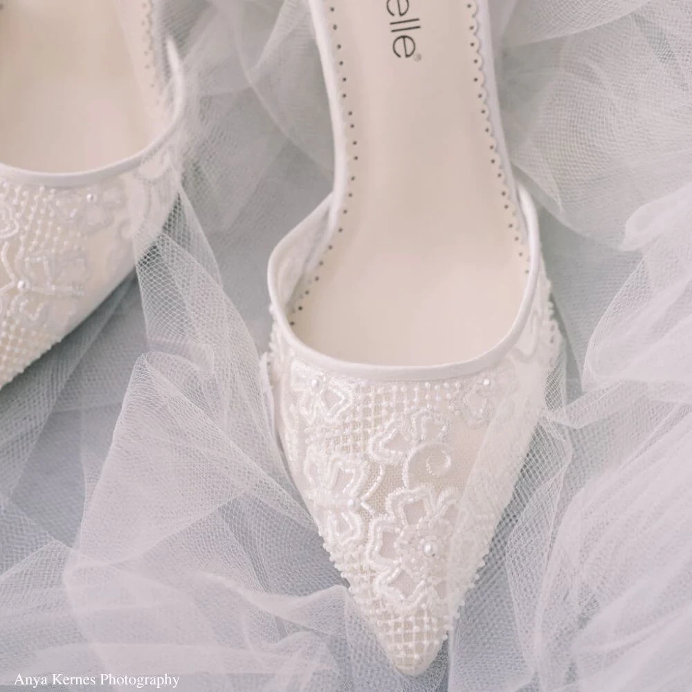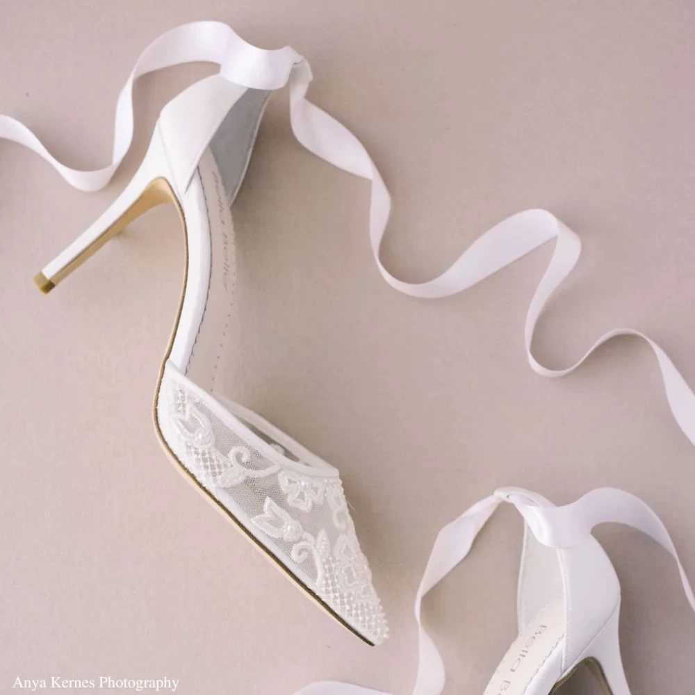Silk ivory ribbons wrap around the ankles of these ivory wedding shoes with pearls and knot into a trim bow. The upper showcases a floral lace embellishment on ivory illusion mesh. Only the most discerning observer will spot the delicate pearl beads incorporated into these ivory lace heels. Perfect for classic and romantic bridal ensembles.