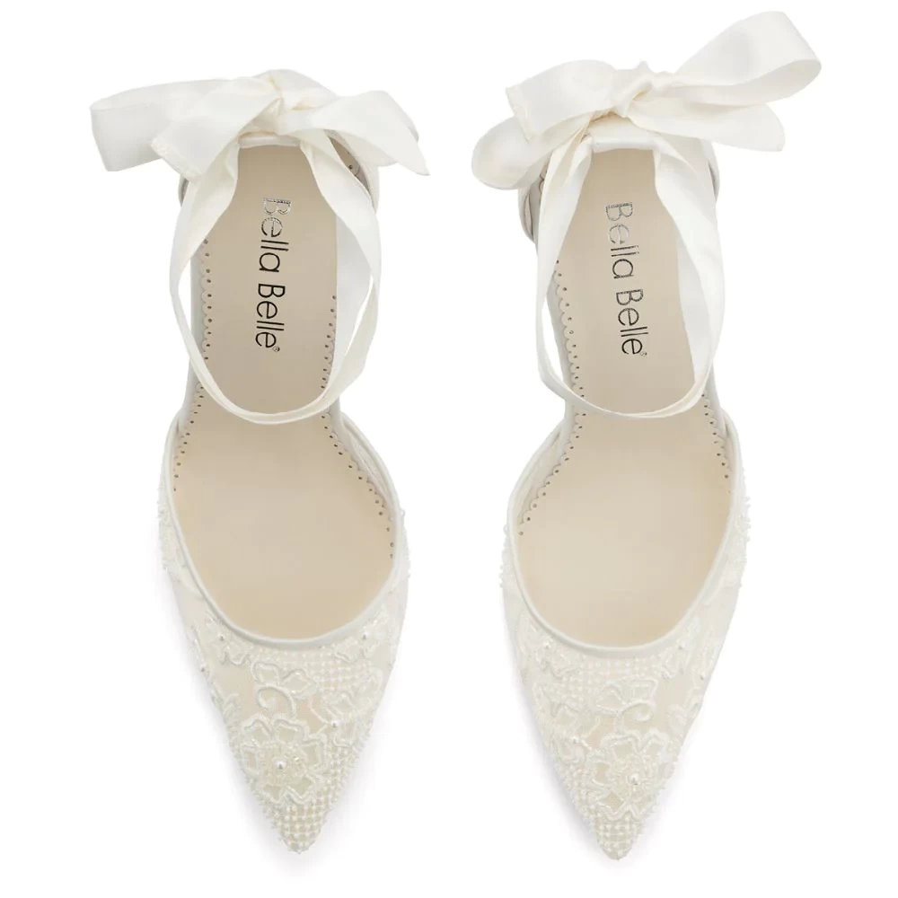 PENELOPE Ankle Wrap Lace Ivory Wedding Shoes with Pearls