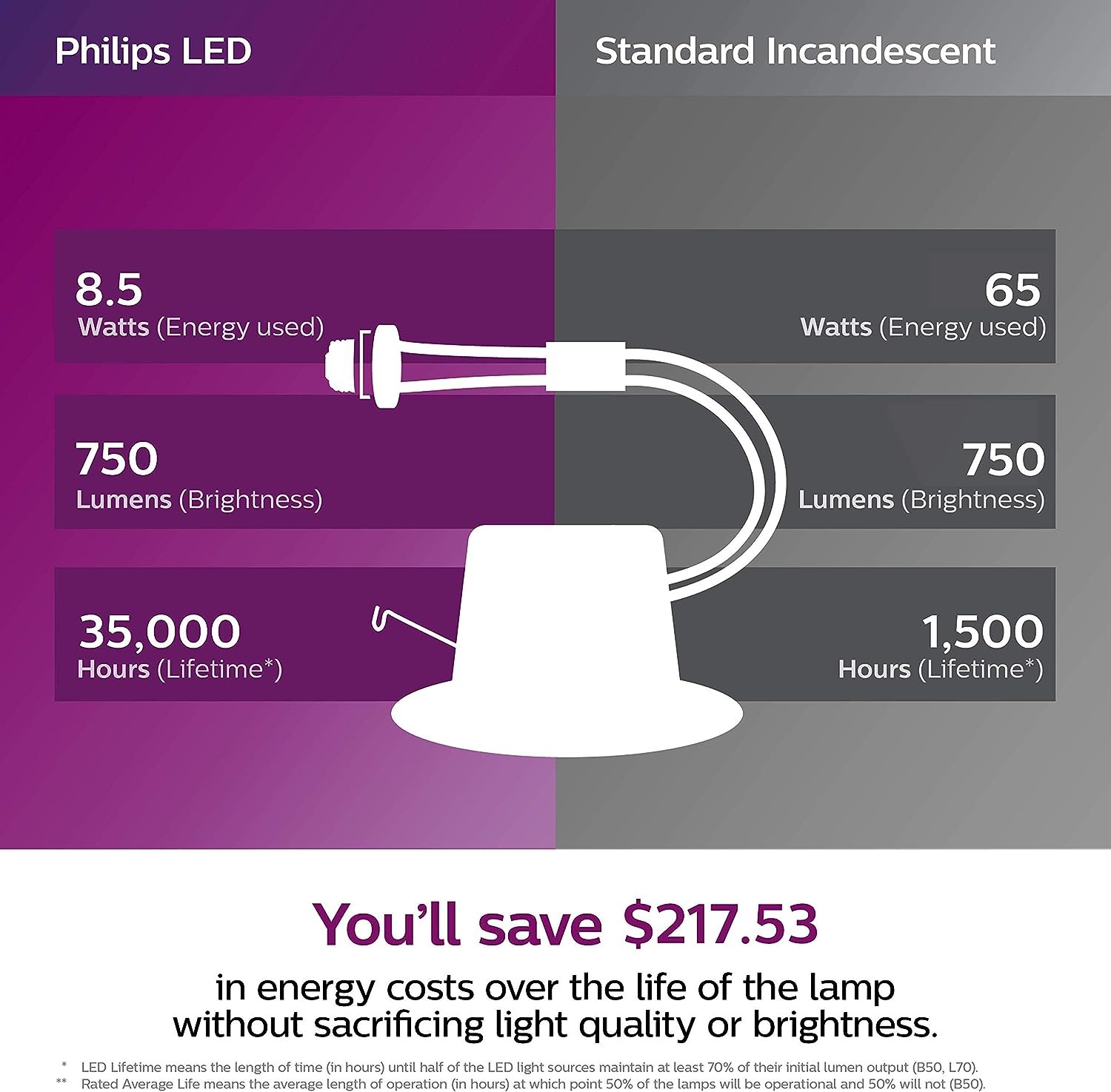 LONG LASTING: These Philips LED Downlight Recessed Lighting Fixtures last 13x longer than incandescent and halogen bulbs; Each fixture is expected to deliver a lifetime of up to 35, 000 hours of light (based on three hours per day), saving you the cost of frequent bulb replacement