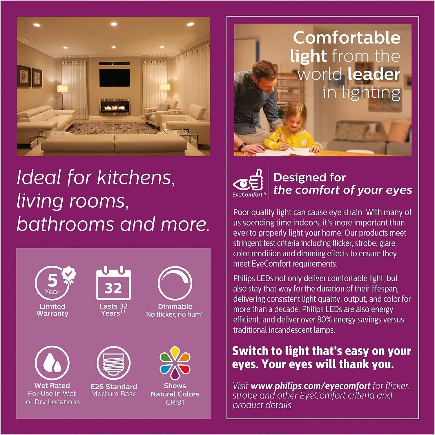 SMOOTH DIMMING: Philips dimmable LED fixtures are flicker free, silent, and tested to work with more dimmer switches than any other LED bulbs on the market; These recessed lighting fixtures smoothly dim from 2700K down to a soft glow with greater clarity than traditional incandescent bulbs