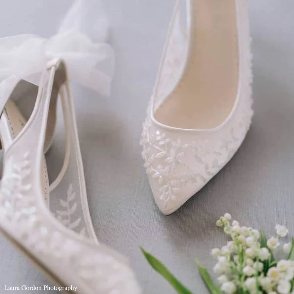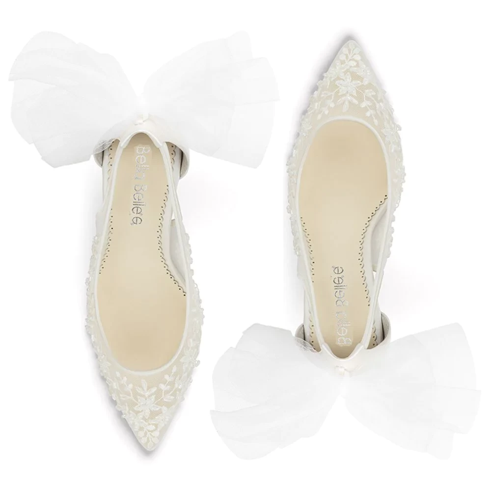 These beaded wedding shoes feature elegant lace floral patterns on ivory illusion mesh. A removable oversized tulle bow at the back adds flair for more dramatic bridal ensembles. A cutout at Edna's upper completes these high heel beaded shoes for wedding glamour.