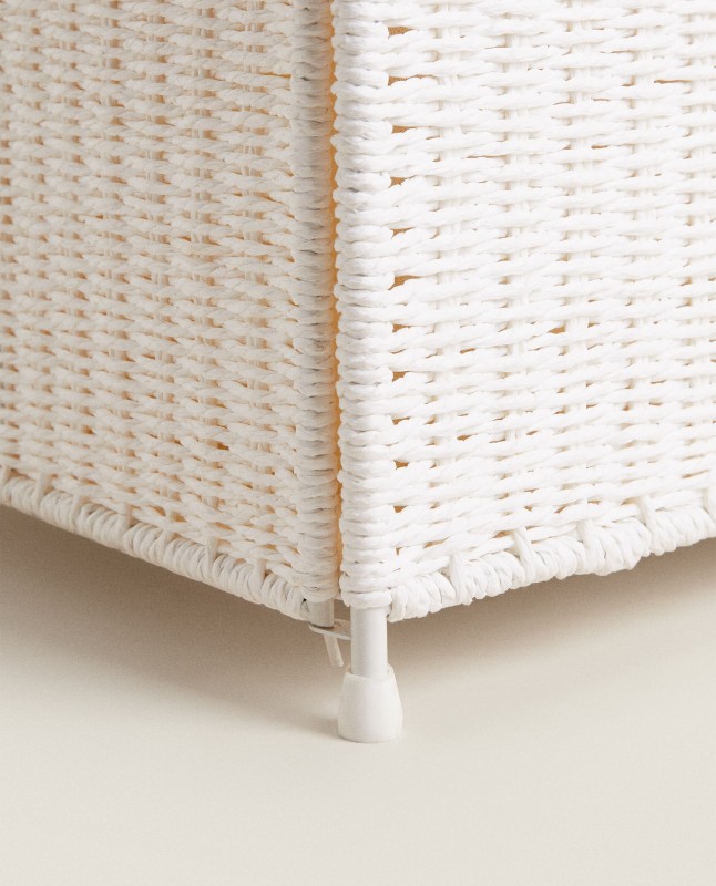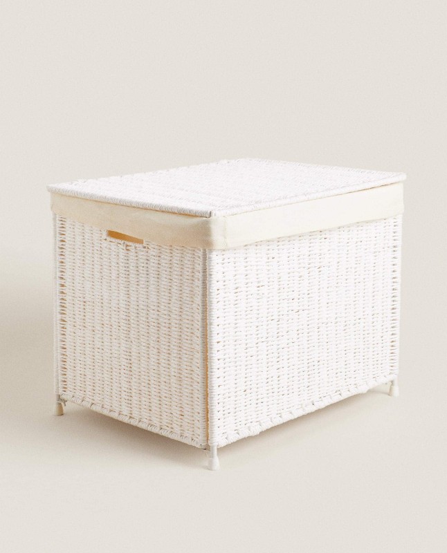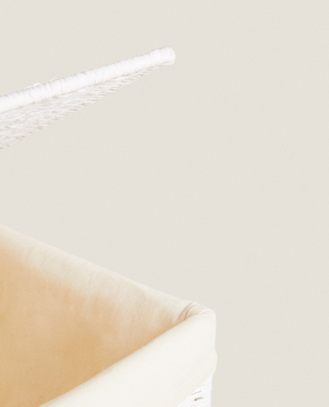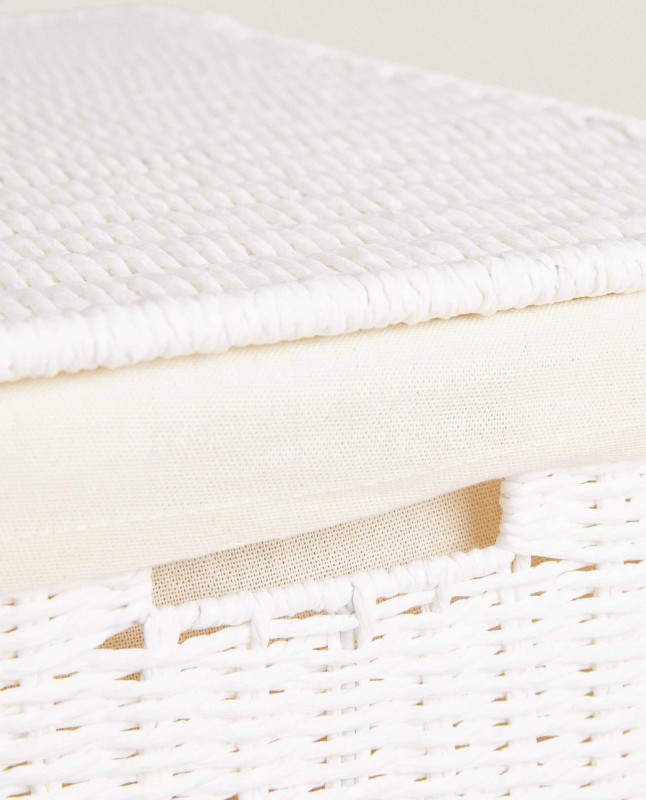 Laundry chest featuring a metal frame covered in resistant paper, with a rectangular base and fabric lining made of linen and cotton. Totally foldable for easy storage.Removable and washable fabric lining.