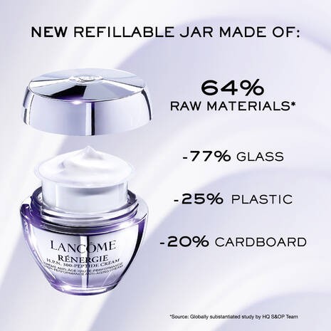 We are reinventing the way we design and develop our products, making sustainability a priority without any compromise on safety and product performance. Rénergie H.P.N. 300-Peptide Cream uses a more sustainable packaging made of 64% raw materials (-77% glass, -25% plastic, and -20% cardboard)* and comes in a refillable packaging. Replenish your peptide moisturizer with a sustainable refill capsule to help reduce the impact on the environment.
