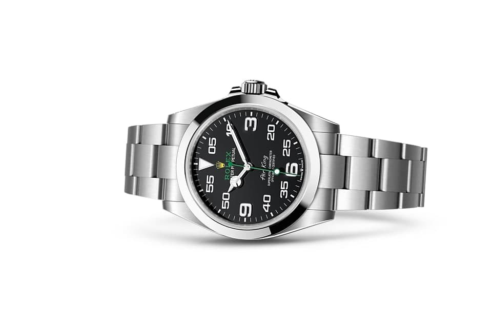 The Air-King has a personalized black dial with large Arabic numerals at 3, 6 and 9 o'clock and a prominent minute scale for easy reading when sailing. On the dial are the words "Air-King", in a font designed for the original model in the 1950s.