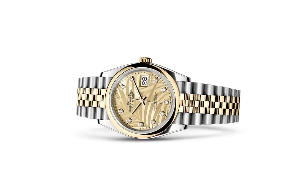 The dial features an 18-carat gold base set with diamonds. With its expertise and state-of-the-art equipment, Rolex continues to develop and create new watch faces that bring a vibrant color to the appearance of its watches. The Rolex watchmakers have reinterpreted the brand's iconic and distinctive sunray effect on the watch face by engraving a new pattern with a femtosecond laser, which uses extremely short electromagnetic pulses to leave an imprint on the dial. The palm leaf motif is inspired by lush vegetation, and the cascading palm leaves create a visual effect of light and shadow.