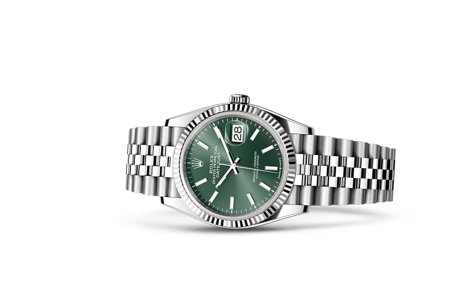The Rolex triangle pattern is a characteristic feature of the brand's watches. Initially, the OYSTER bezel's triangular pitches served a practical purpose, helping to secure the bezel to the case by screwing it down and ensuring that the watch was waterproof. The same was true of the pitched caseback, which was screwed into place with a special Rolex tool. Later, the triangular pitched pattern evolved into an aesthetic design element that has become an iconic feature of Rolex. Today, it is a characteristic feature of the brand's watches, and this Datejust 36 has a bezel made of gold.
