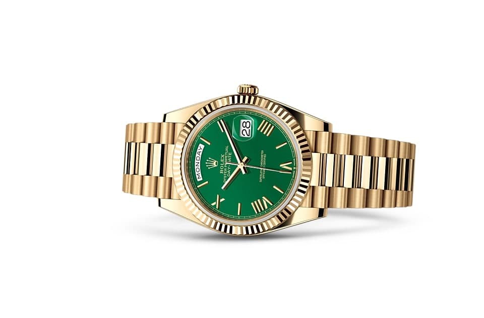 The Rolex bezel is a characteristic feature of the brand's watches. Initially, the OYSTER bezel was intended to serve a practical purpose, helping to secure the bezel to the case by screwing it down and ensuring that the watch was water-resistant. The same was true of the pitched caseback, which was screwed into place with a special Rolex tool. Later, the triangular pitched pattern evolved into an aesthetic design element that has become an iconic feature of Rolex. Today, it is a characteristic feature of the brand's watches, and this Day-Date 40 has a bezel made of gold.