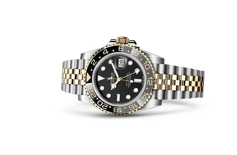 This model features a black dial and a two-tone gray and black Cerachrom ceramic bezel. In addition to the traditional hour, minute and seconds hands, the GMT-Master II is equipped with independent 24-hour hands and a bi-directional rotating bezel with a 24-hour scale, which is uniquely colored to indicate the reference time in the first time zone (e.g. place of residence), and which can be read off on the scale on the opposite side of the bezel. The cleverly designed independent regulating hands allow the wearer to adjust the time easily via the winding crown, without affecting the minute and seconds hands. The traveler can therefore read the time at both the place of departure and the place of location at any given time, ensuring precision.