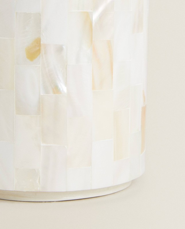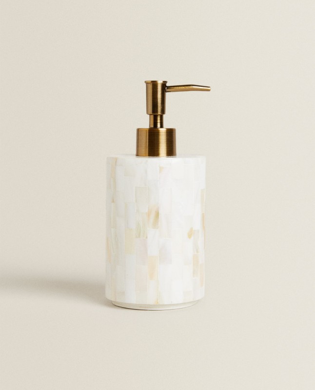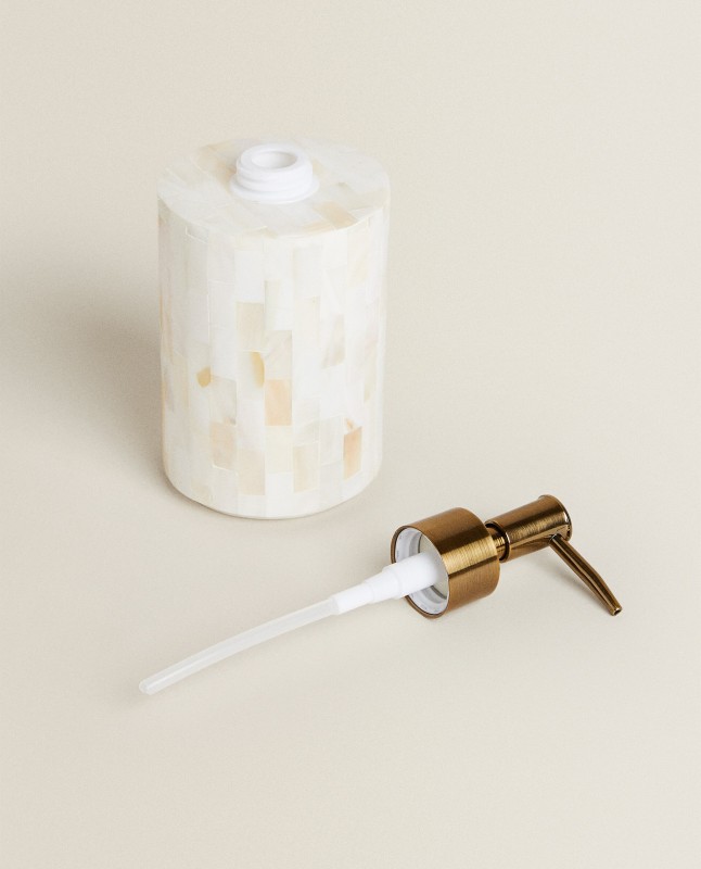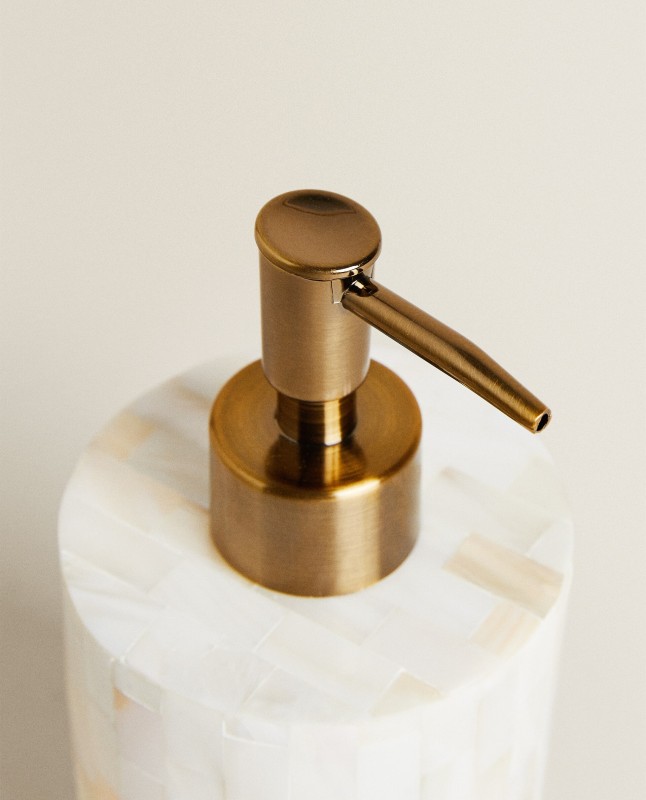 Cylindrical mother-of-pearl dispenser with a golden steel nozzle.