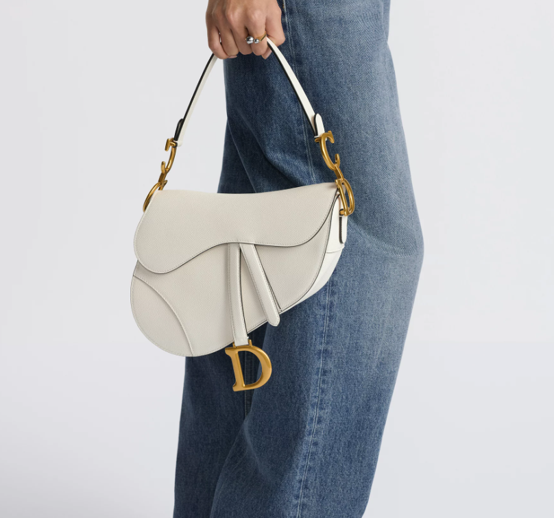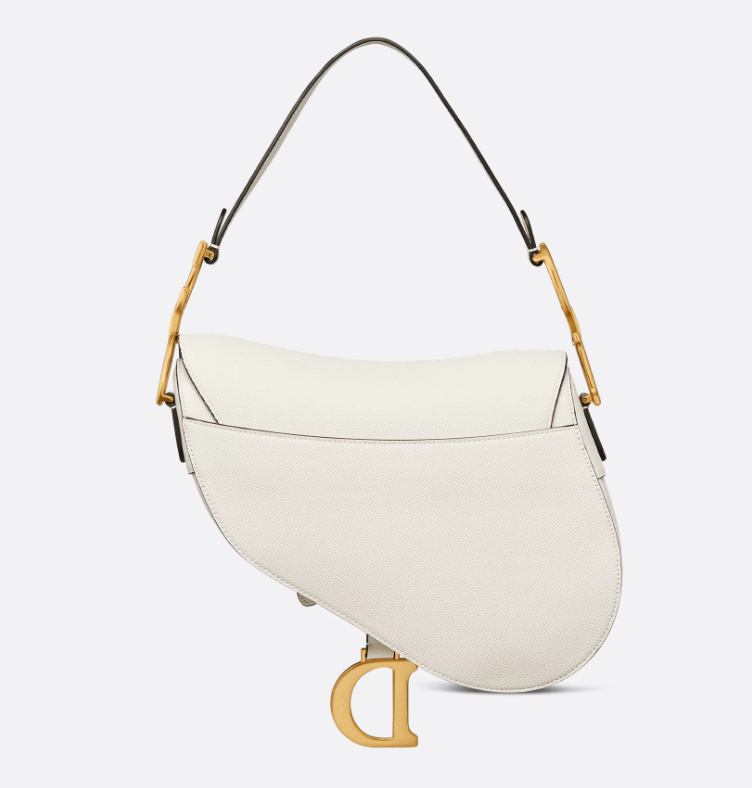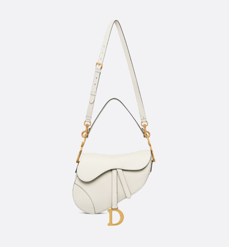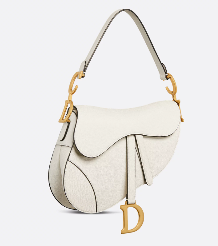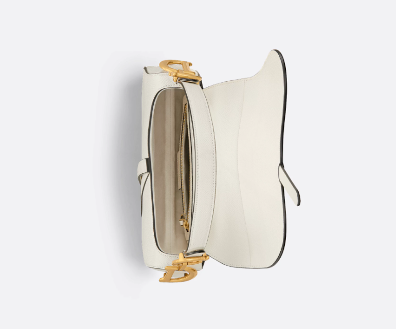 Maria Grazia Chiuri brings a fresh update to the iconic Saddle bag. Crafted in latte grained calfskin, the legendary design features a Saddle flap with a D stirrup strap and magnetic pull, as well as an antique gold-finish metal CD signature on either side of the handle. Equipped with a thin, adjustable and removable strap, the Saddle bag may be carried by hand, worn over the shoulder or crossbody.