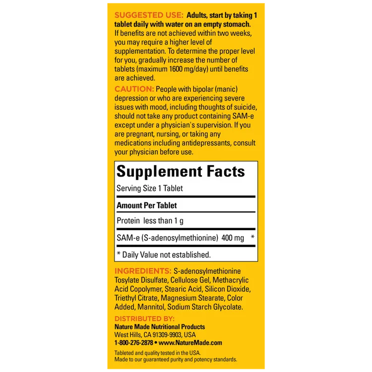 A healthy mood sets the tone for your whole day. SAM-e is a molecule made in the cells of our bodies. However, SAM-e levels can run low due to various factors such as diet and aging. Nature Made® SAM-e Complete®◆ can help to replenish your SAM-e levels and restore your healthy mood in as little as 7–14 days when taken daily. Nature Made® SAM-e also helps support joint comfort, which may naturally deteriorate with physical activity and age. SAM-e provides a source of sulfur, which is a critical component of joint tissue. It's now that much easier to stay on top of your health.†