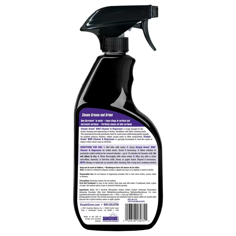 Simple Green Bike Cleaner and Degreaser is a high-performance cleaner formulated to meet the cleaning needs of today's riders. It cuts through tough, caked-on mud, dirt, grease, grime, and other road and trail soils without harm to bike surfaces. Use on all bike parts including metal, rubber, plastic, painted surfaces and delicate components including chains and derailleurs. The aerosol foaming formula sticks to surfaces while removing grease, oil, dirt and road grime and provides excellent vertical clinging power for hard-to-reach spaces. Delivers powerful cleaning without harsh chemicals that can damage parts.
