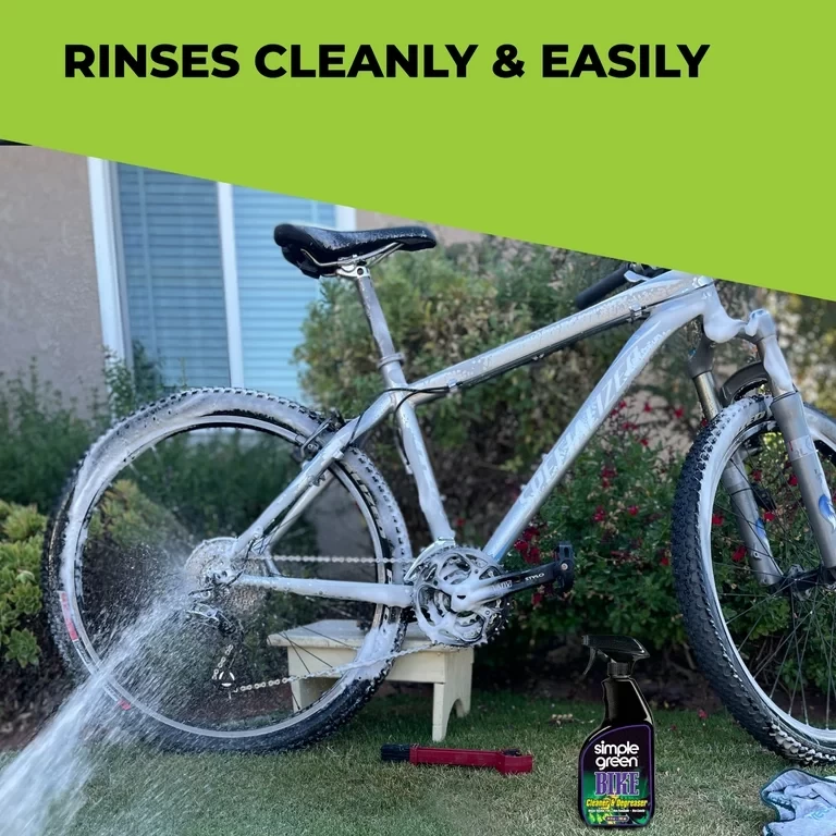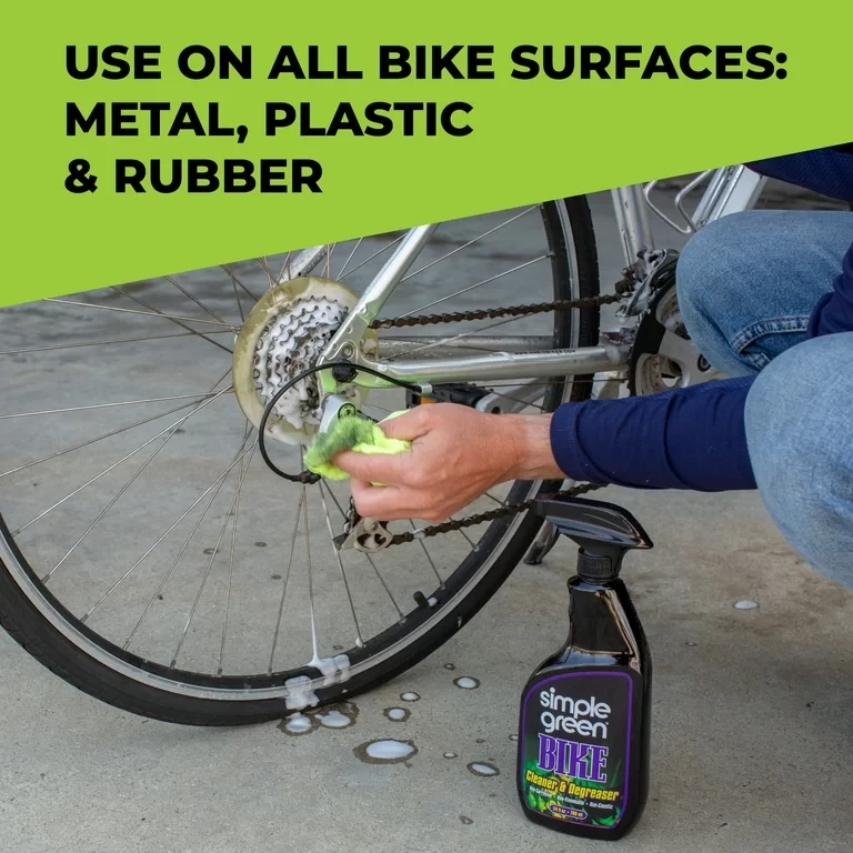 Wet bike with water, Use foaming spray setting if desired. Spray Simple Green® BIKE Cleaner & Degreaser on soiled areas and scrub if necessary. Allow the solution to penetrate soiled surfaces for several minutes and up to 10 minutes for heavier soils. Do not allow the formula to dry before damp wiping or rinsing. Wipe the surface with a damp cloth or rinse with clean, ambient water. Then dry with a clean microfiber, chamois, or lint-free cloth, towel, or paper towel. Repeat if necessary. NOTE: Always re-lubricate as needed after cleaning.